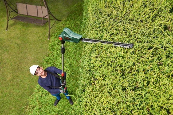 - Телескопічна штанга та обертова головка дозволяють зрізати гілки з землі, не використовуючи драбини