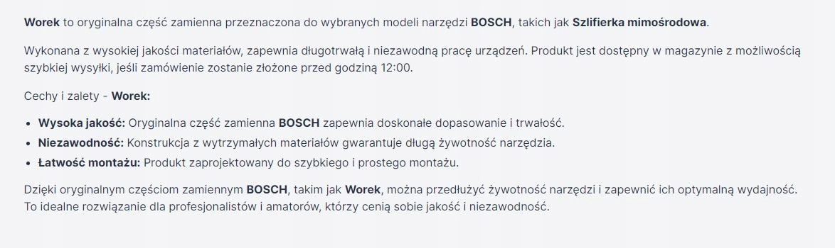 Просматривая «Bosch Worek na pył GEX 125/150 2.605.411.096 ORYGINALNY», вы можете быть уверены, что данный товар из каталога «[rubrica_name]» будет доставлен из Польши и проверен на целостность. В цене товара, указанной на сайте, учтена доставка из Польши. Внимание!!! Товары для Евросоюза, согласно законодательству стран Евросоюза, могут отличаться упаковкой или наполнением.