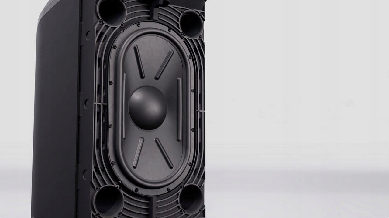 Вбудований сабвуфер з унікальним датчиком RaceTrack забезпечує потужні баси, оптимізований центр ваги та займає мало місця. Цей тонкий динамік розміром 7 x 13 дюймів забезпечує якість, яка конкурує зі звичайним 12-дюймовим низькочастотним динаміком більшого розміру. Він займає мало місця в транспортному засобі та на сцені, тому його легко переміщати з дому в автомобіль або з автомобіля на концертний майданчик.
