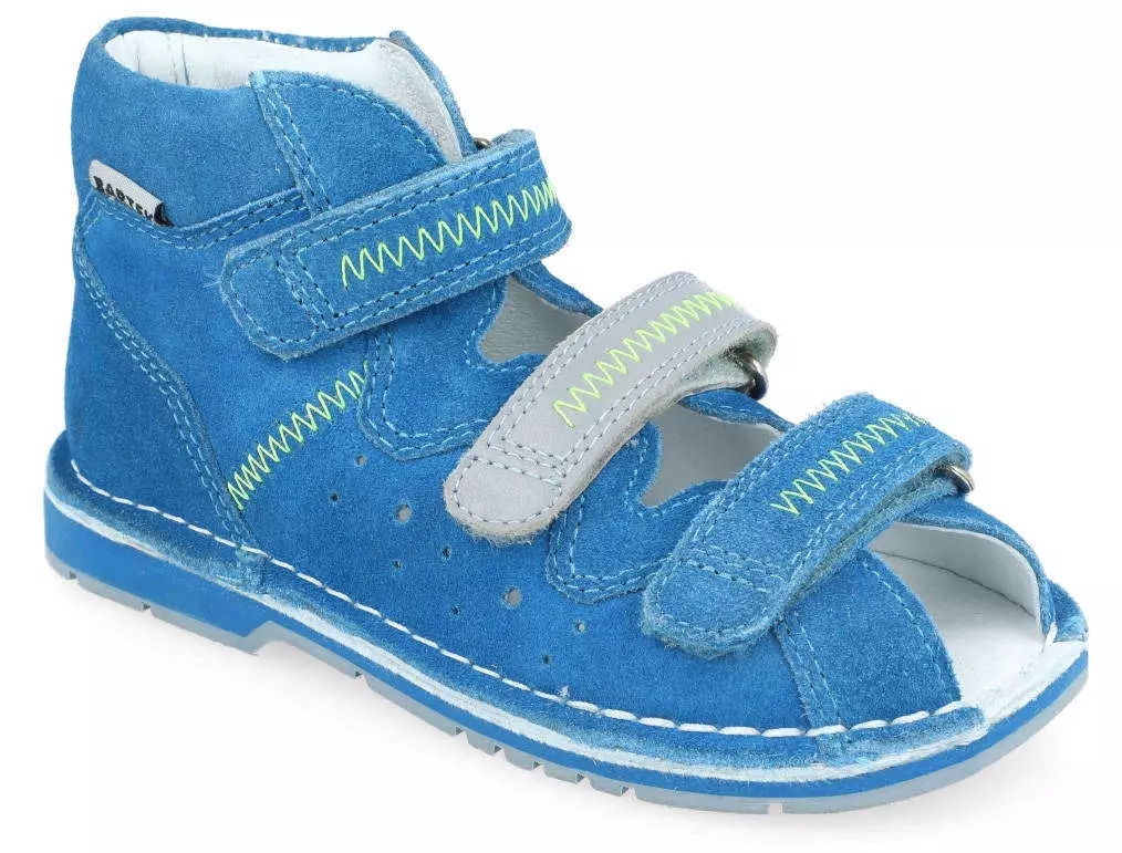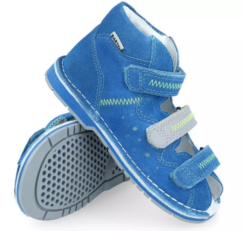 Зручні профілактичні босоніжки BARTEK модель 165261, застібаються на трирядні липучки. Повністю виготовлений зі шкіри найвищої якості. Термогумова підошва і посилена п'ятка стабілізують стопу дитини.