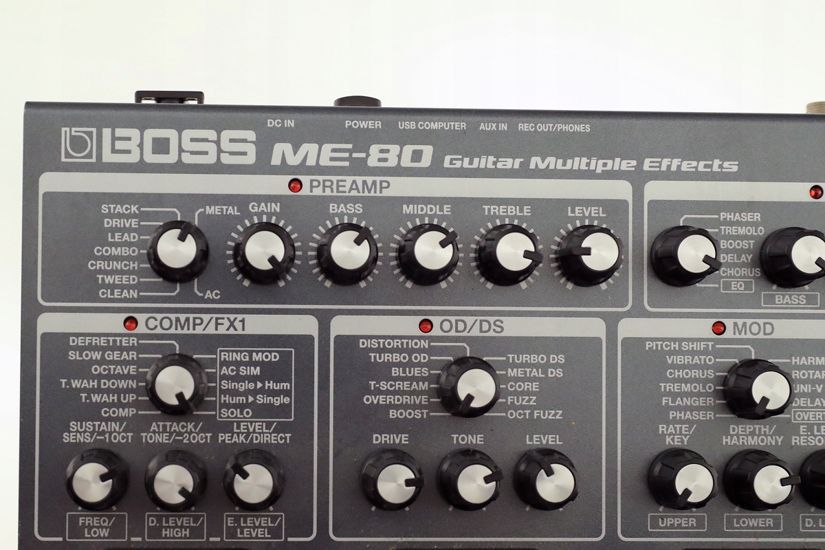 На ринку нічого немає. в одному корпусі, який давав би ідеальні результати і був би простим і навіть інтуїтивно зрозумілим у використанні. Boss (Roland) є абсолютним лідером ринку гітарної периферії. Наступником ME 80 є GT1000, який коштує 4500 злотих. Ціна висока, але це не проблема. Керувати GT1000, м’яко кажучи, дуже складно. Ви повинні натиснути кнопку, щоб викликати наступні функції, приховані у вкладках, і використовувати другу кнопку, щоб змінити та модулювати їх, що настільки дратує, що більшість людей, які раніше користувалися ME 80 і купували GT 1000 заохочувані рекламою, відмовляються від його використання разом, або навіть більш амбіційні люди вводять в пам'ять 4 базові налаштування і користуються тільки ними... То навіщо платити 4500 злотих? Виправдання немає. У Boss ME 80 все «на поверхні», тобто не потрібно заходити в «приховане» меню, досить натиснути одну клавішу і все відразу видно неозброєним оком. Цей мультиефект містить абсолютно все, про що може мріяти будь-який гітарист; є види підсилювачів на вибір в одному розділі; у другому ми можемо, наприклад, встановити октавер і грати як бас; у наступному ви можете використовувати ручку для встановлення, наприклад; fuzz distortion і після натискання на педаль можна відразу грати соло; наступна клавіша і, наприклад, ми встановлюємо приспів і маємо звук Lady Pank... ; і т. д. Це справді дуже хороший ефект і настільки простий, що ви можете використовувати його без інструкцій. Якість самих звуків (якщо не перестаратися) відмінне. Встановлення гітари в режим METAL, наприклад, дає дивовижний ефект для соло в цьому стилі; те саме для кожного наступного звуку; ділей, дисторшн і т. д. Також варто згадати дуже чіткий і точний тюнер для налаштування гітари. Просто натисніть кнопку MEMORY і утримуйте її протягом 3 секунд. і все затихає, а на дисплеї вмикається тюнер.