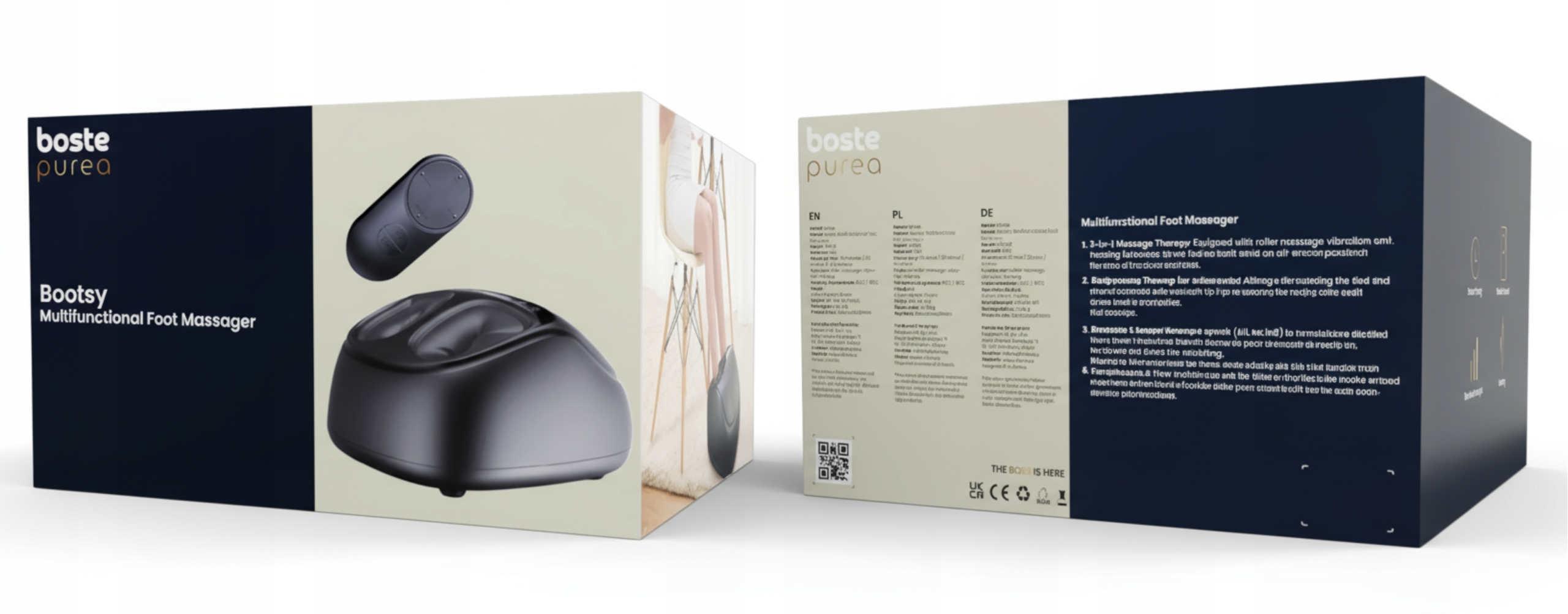 Відкрийте для себе справжнє розслаблення з масажером для ніг Boste Purea Bootsy. Цей прилад створений для людей, які хочуть подбати про втомлені ноги та стопи після довгого дня. Завдяки технології VibroHeat 3D ви можете поєднати три форми масажу в одному - ролики, вібрацію та заспокійливе тепло.