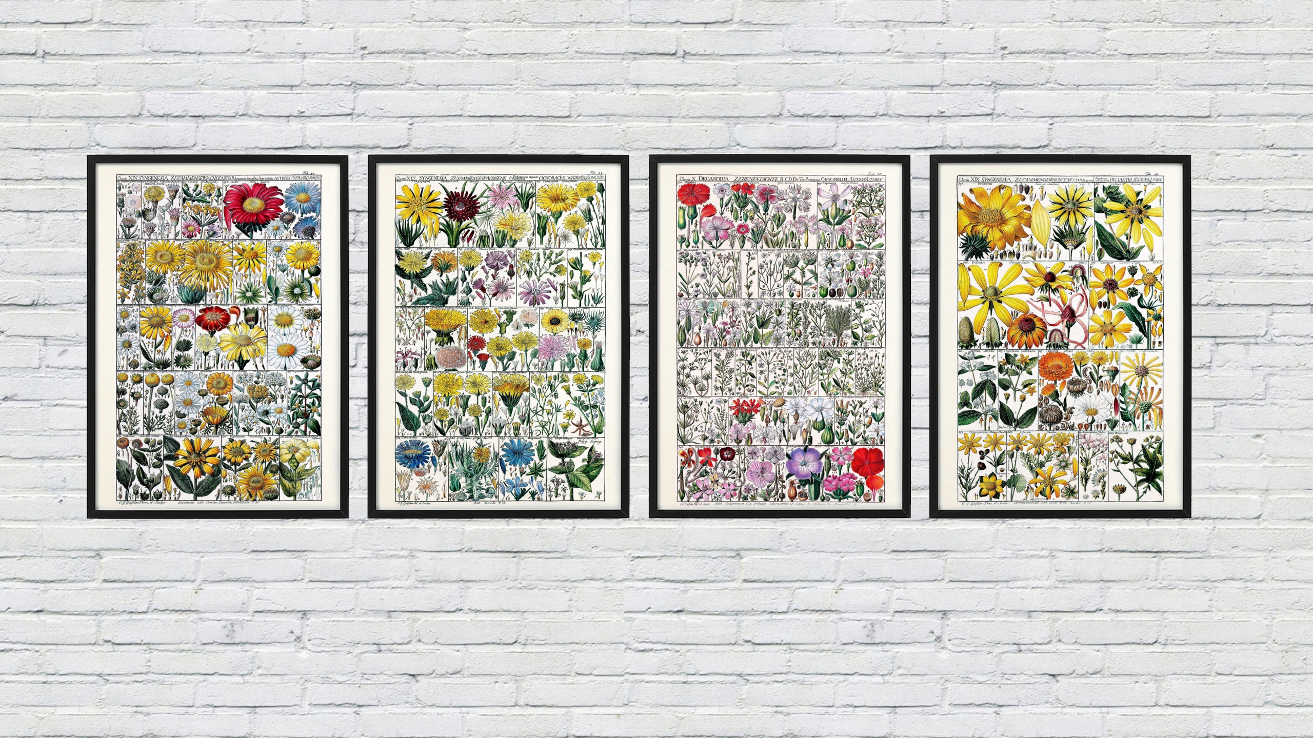 Набір із чотирьох красивих старовинних літографій із зображенням лугових, садових та лікарських квітів, серед яких: айстри, шишки, флокси, чорнобривці, ромашки, гвоздики, цикорій і багато інших, можна дивитися і дивитися, як на лузі:) Благородний папір з тонкими смужками. Висока вага 220 г.