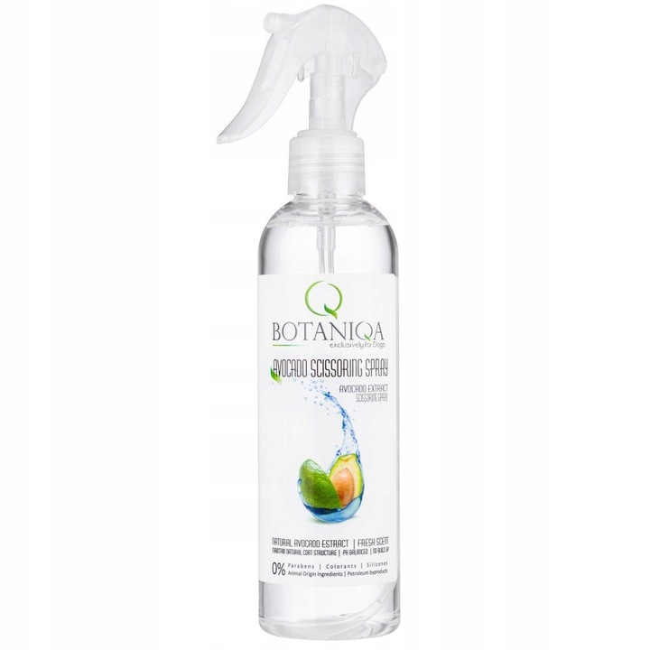 Botaniqa Avocado Scissor Spray завдяки своїм властивостям антистатичний, допомагає контролювати одяг під час різання ножицями та укладання волосся. Він був створений з думкою про грумерів і з певною метою отримання більшого контролю над підстриженим хутром. Може бути використаний багато разів протягом одного сеансу догляду, оскільки це не обтяжує шерсть, не склеює волосся і не залишає слідів. професійний Формула цієї косметики заснована на інгредієнтах походження природний. Підходить для використання як на сухих, так і на вологих поверхнях халат. Має свіжий і приємний аромат, який зберігається надовго багато часу. Препарат простий у використанні та має зручний розпилювач полегшує застосування. Його можна використовувати для розпушування одягу або як Спрей для розчісування.