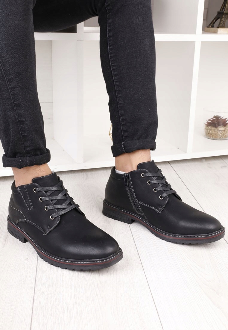 Чоловічі ботильйони на плоскій підошві. Верхня частина трохи вище щиколотки. Застібається збоку на блискавку і додатково зав'язується на шнурки спереду. Сильно ізольований. Виготовлений з екологічної шкіри. Ідеальне взуття для холодних зимових днів.