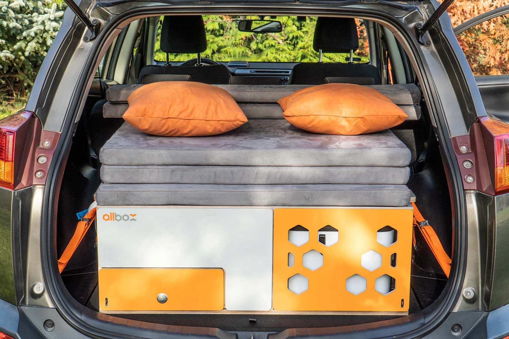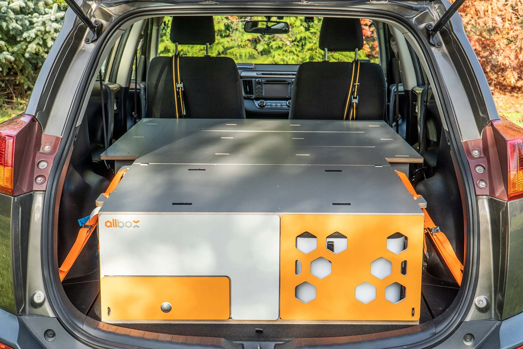 Верхня частина Allbox - це розкладне ліжко з зручним матрацом. Легка фанерна рама, дизайн рами ліжка дозволяє використовувати повну ширину внутрішніх приміщень автомобіля завдяки розширенню. Підняті панелі ліжок полегшують доступ до багажу.