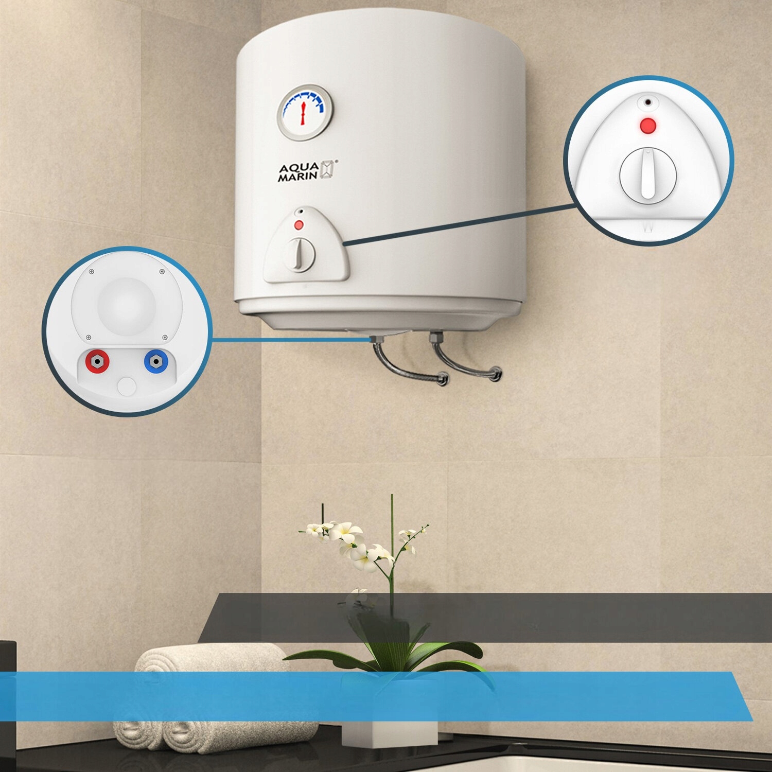 Електричний котел, резервуар з гарячою водою німецької марки Aquamarin® - це практичне та економічне доповнення до вашої ванної кімнати - цей котел нагріває воду до 75 ° С і підтримує зручну температуру до двох днів. Внутрішня частина танка покрита захисним шаром емалі, який захищає їх від корозії та забезпечує довше життя. Vitality)
