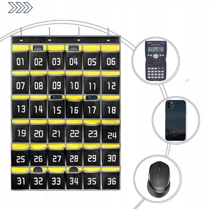 Революційне рішення! Більше ніяких відволікань від мобільних телефонів. Тепер студенти та співробітники, заходячи в аудиторію, можуть покласти свої смартфони в позначені кишені органайзера, що дозволяє їм повністю зосередитися на навчанні чи роботі.