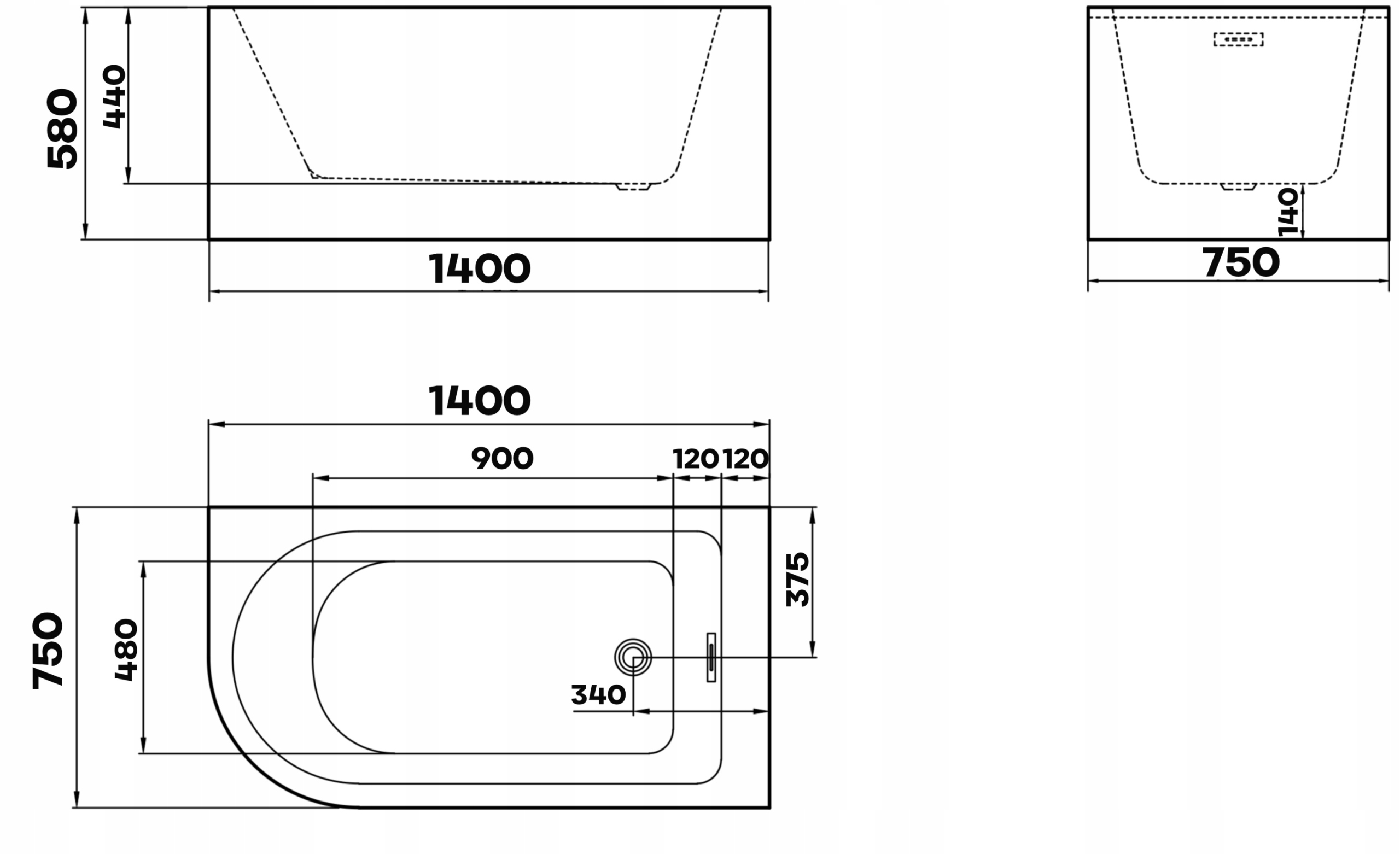 АКРИЛОВА НАСТІННА ВАННА ОКРЕМНО СТОЯЧА