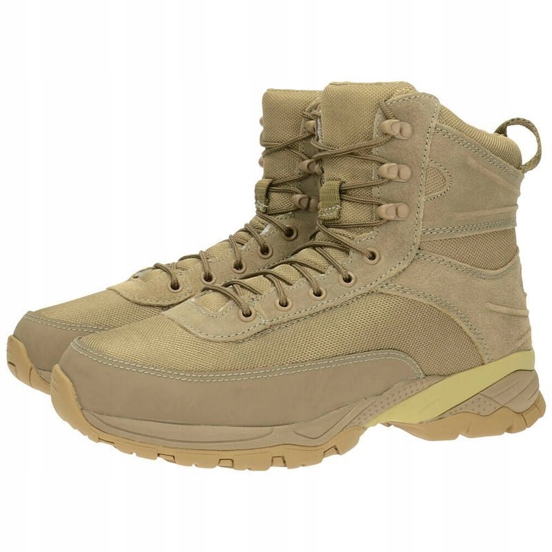 Тактичне взуття наступного покоління буде справлятися в будь -якій місцевості. Завдяки поєднанню замшевої шкіри та нейлонової сітки циркуляція повітря всередині взуття знаходиться на відповідному рівні . Система шнурівки з 8 кишками полегшує швидке фото та надягання взуття. Бічна частина підошви виготовлена з м'якої піни EVA. Завдяки цьому комфорт завантаження взуття дуже високий . Це рішення впливає на демпфування поштовхів та неприємних коливань , до яких стопа може бути викрита під час динамічного руху в лісі та скелястій місцевості.