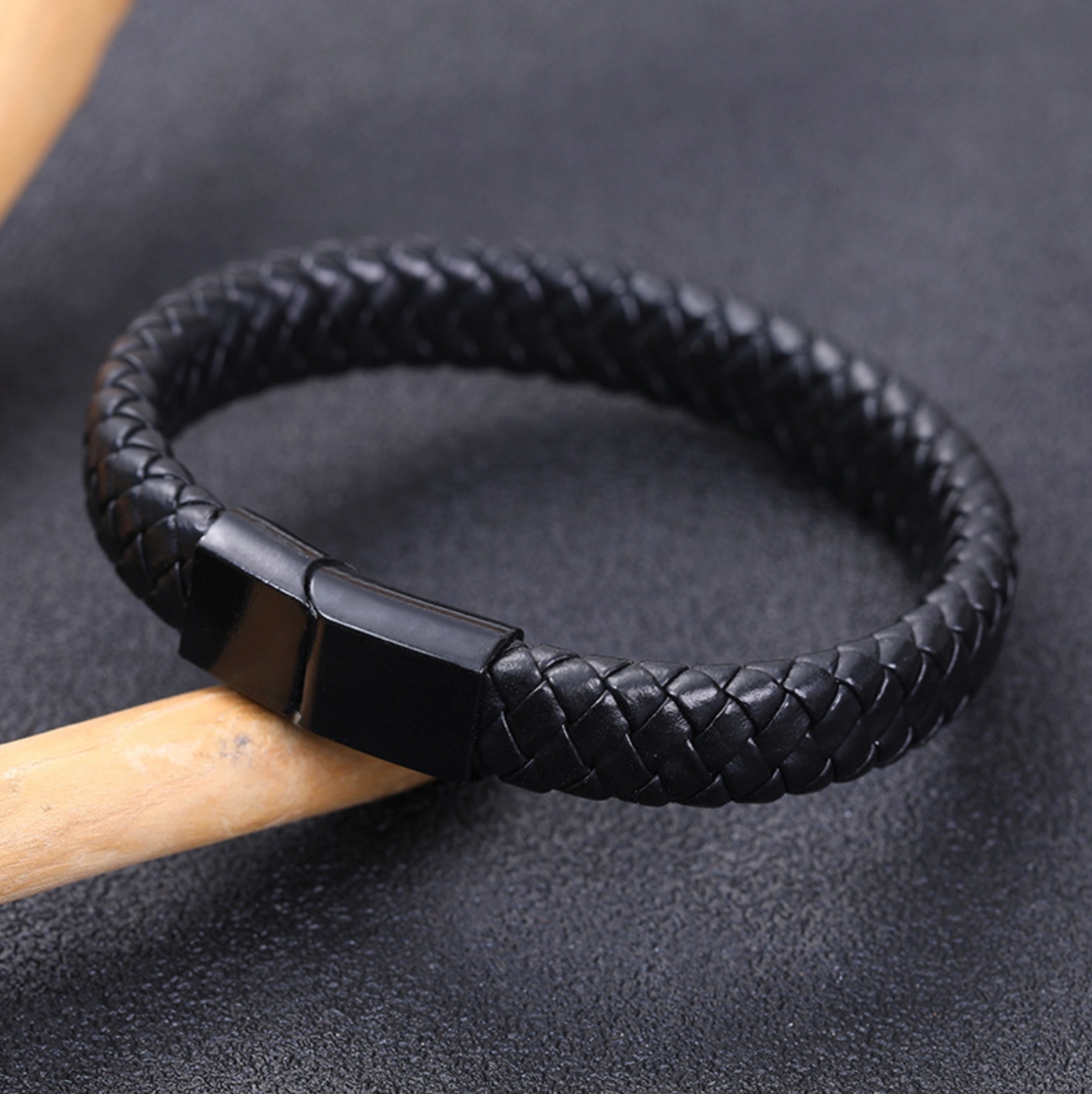 Елегантний чоловічий браслет ручної роботи з однотонної чорної шкіри