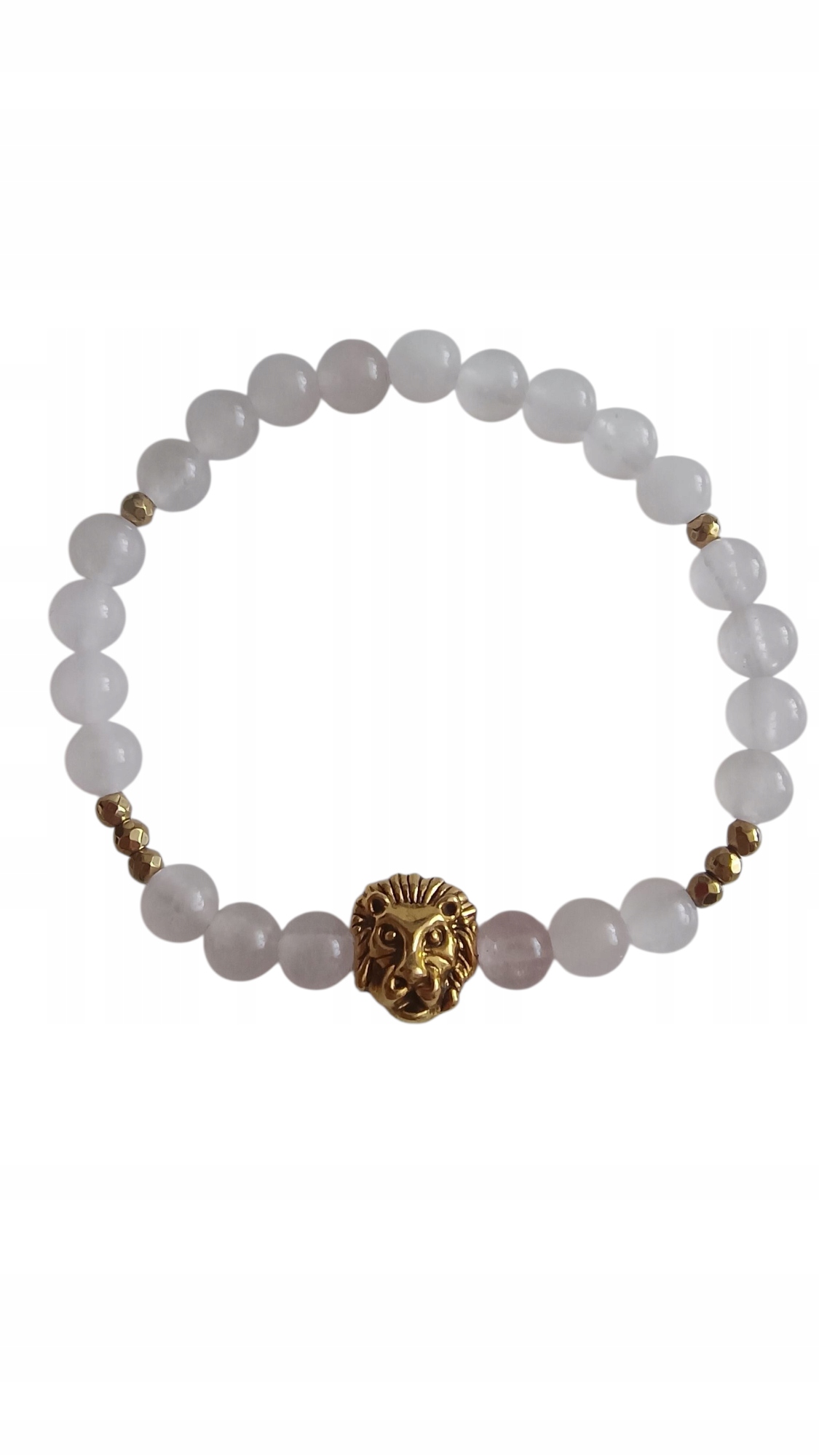 Bransoletka na gumce hand made 16cm rękodzieło kwarc różowy hematyt lew