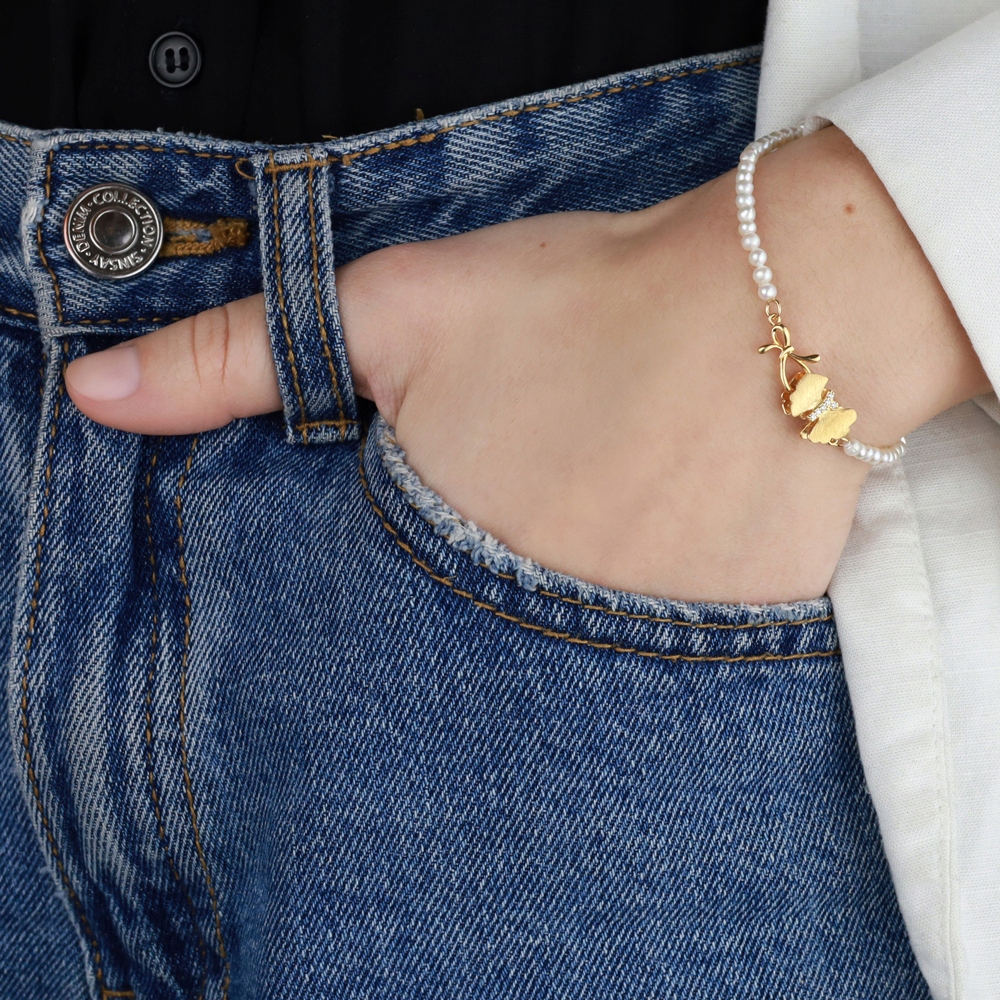 делікатних, ручних браслетів, виготовлених з білих прісноводних перлів. Невеликі перли з закругленою формою будуть чудовими як доповнення до жіночих, щоденних стилізацій.