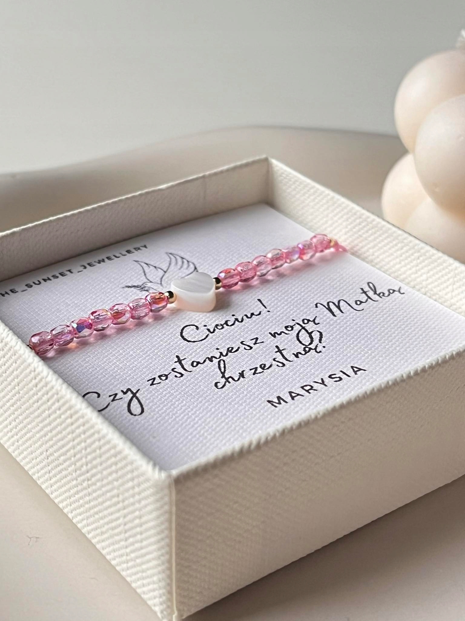 Браслет з перламутру та вогняного польського бісеру, який є ідеальною ідеєю в якості прохання стати хрещеною матір'ю, є унікальним і символічним подарунком, який зможе нагадати вам про духовні цінності та близькість у стосунках між хрещена мати та дитина.