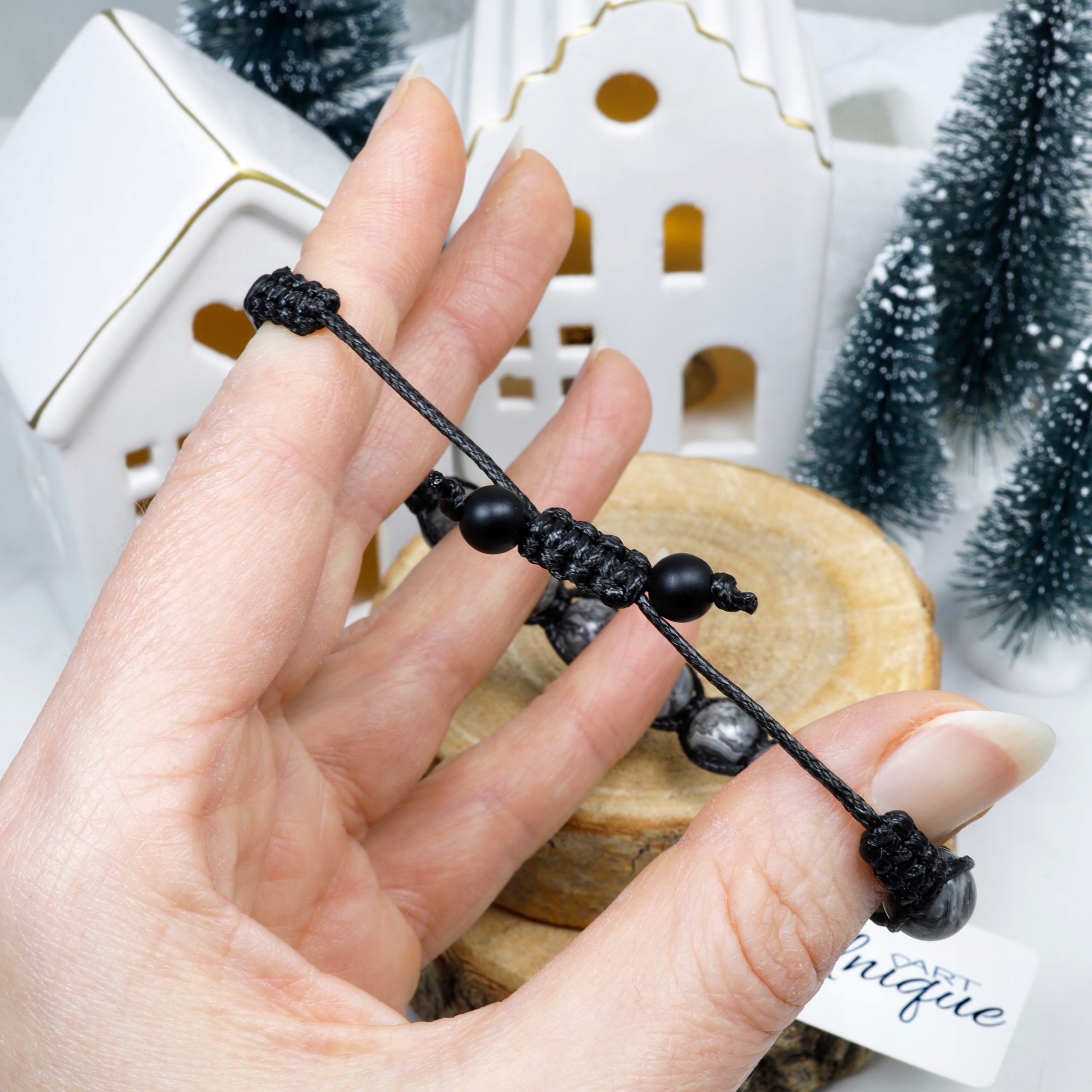 Обхват регулюється за допомогою вузла макраме, що полегшує надягання та зняття браслета та забезпечує зручну посадку на зап’ясті.