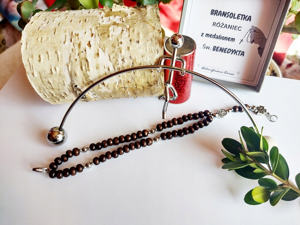 - Браслет виготовлено вручну з дерев'яних намистин (6х4 мм), елементів з нержавіючої сталі та хрест і медальйон св. Бенедикт.