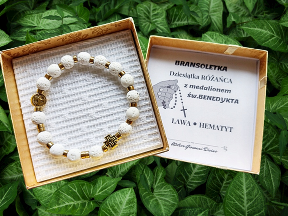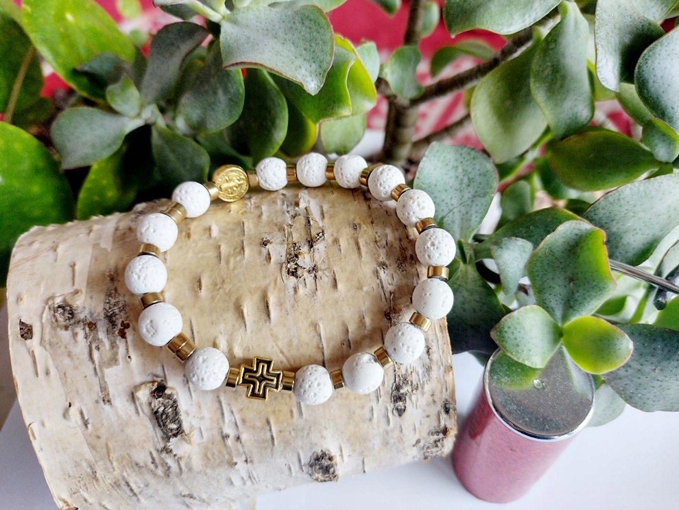 - Браслет виготовлений вручну з натуральних каменів ВУЛКАНІЧНОЇ ЛАВИ (розмір 8 мм), позолочені проставки ГЕМАТИТта Хрест і медальйон св. Бенедикт