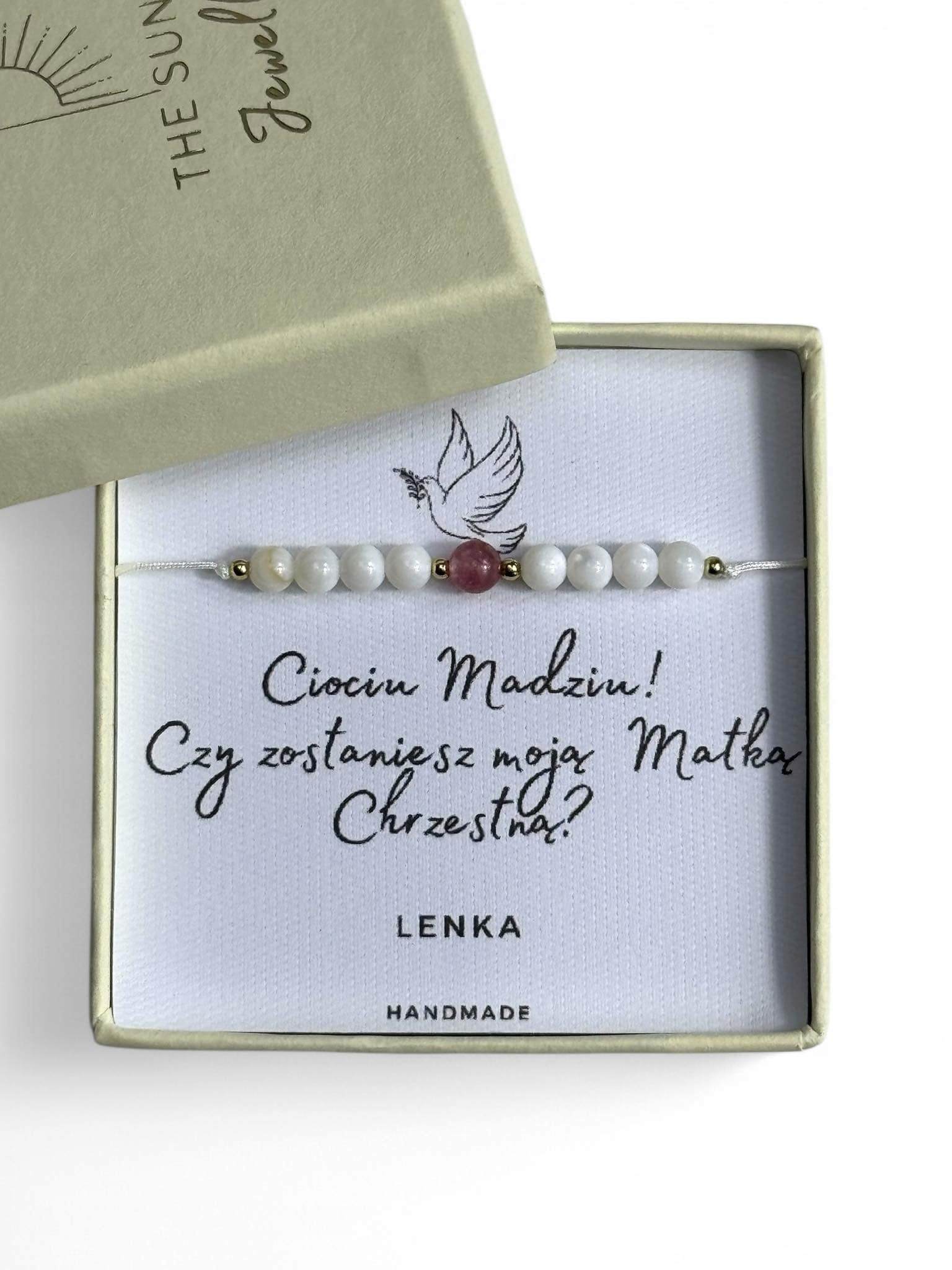 Цей унікальний браслет ручної роботи є чудовим вибором для хрещеної матері в подяці за її присутність та підтримку під час Святого Причастя. Зроблено з пристрастю та турботою, він поєднує витонченість з особистим персонажем. Делікатні, вибрані руки намистини та тонкі деталі створюють унікальний дизайн, який виражає подяку та любов. Ідеально підходить для кожного випадку, особливо для такого важливого моменту в житті, як хрещення та причастя. Браслет стане прекрасним сувеніром, який хрещена мати буде носити з гордістю та настроями.