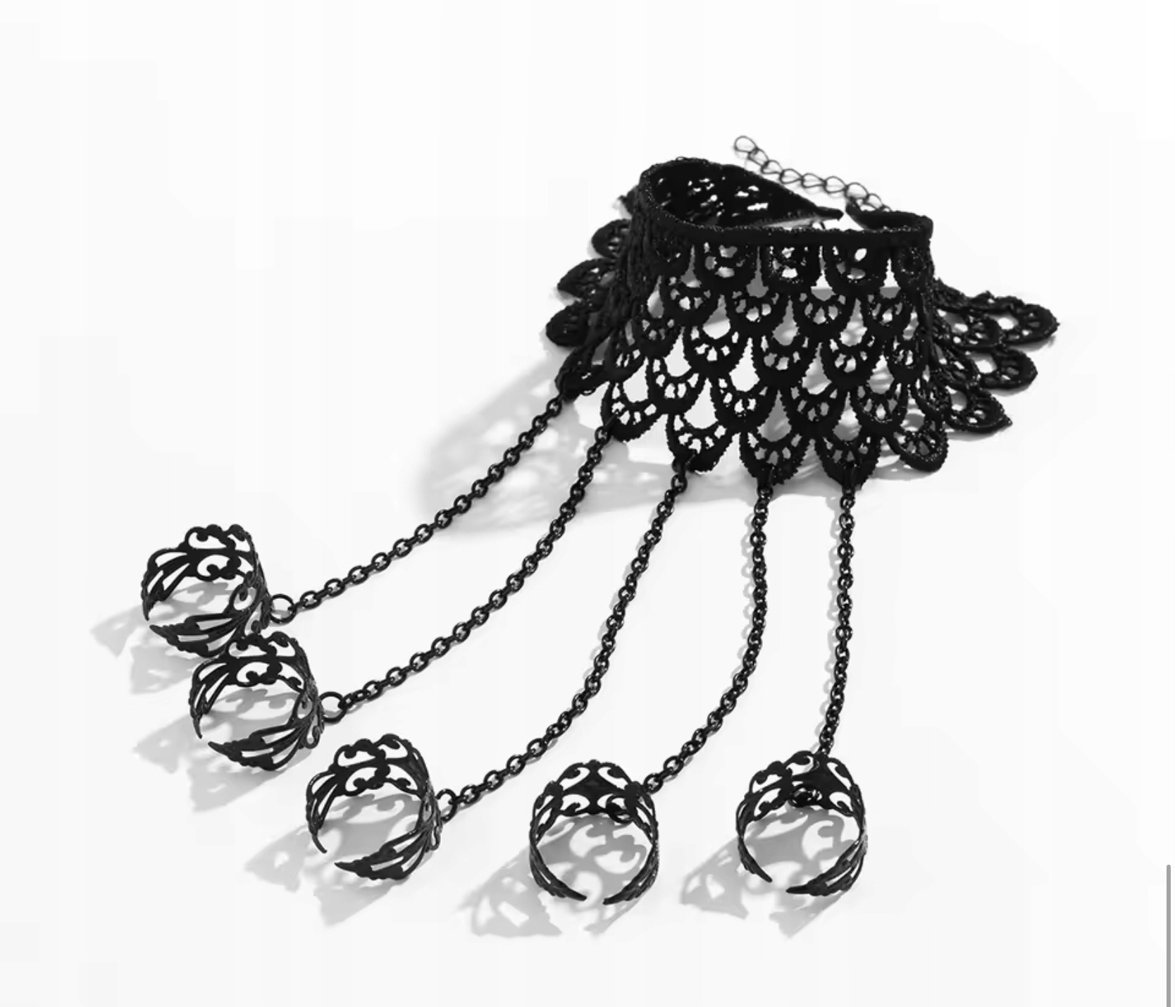 • Унікальний дизайн: Поєднання ніжного чорного мережива з металевими ланцюжками та філігранними каблучками створює дивовижний візуальний ефект на рука.