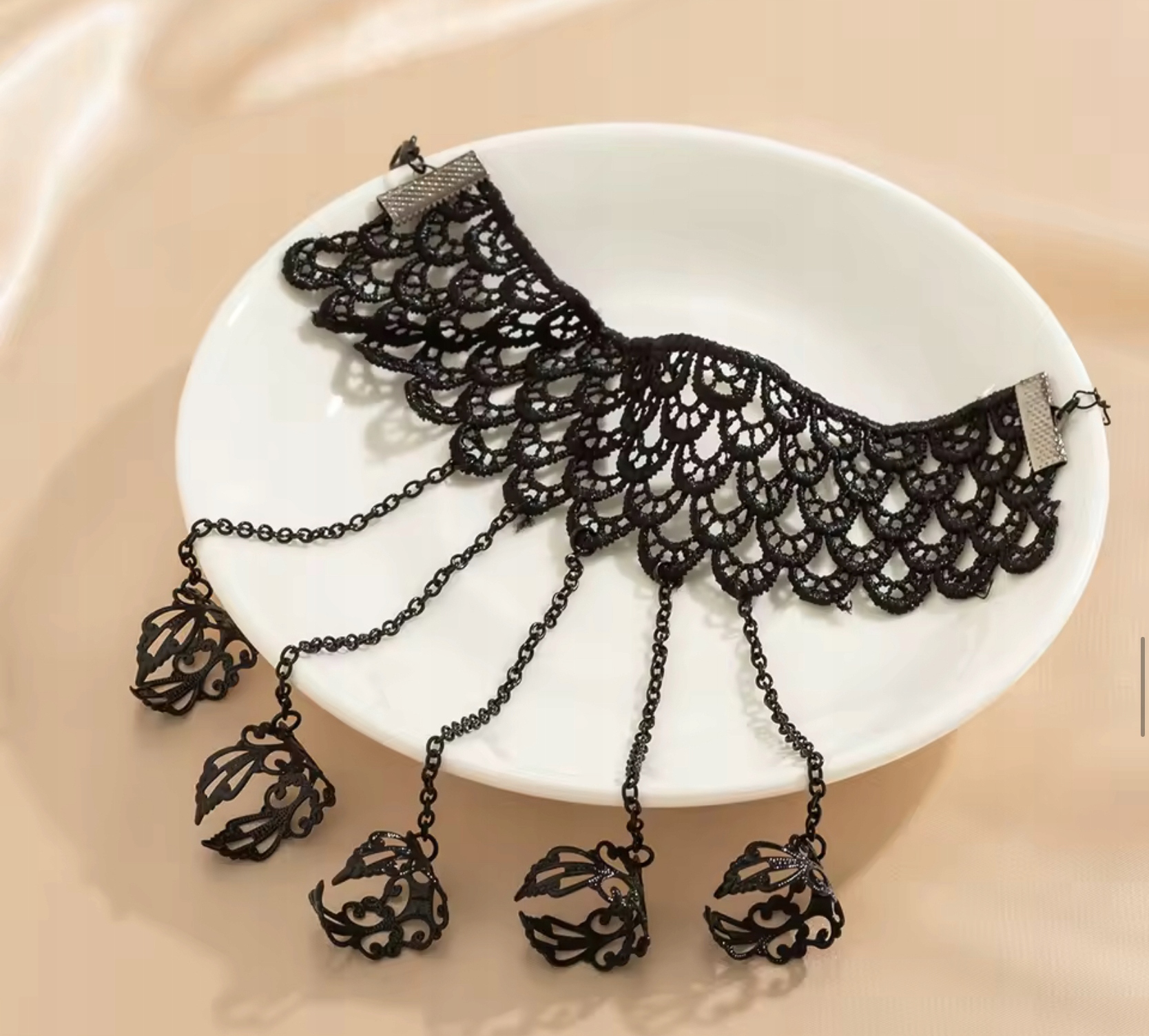 • Матеріал: чорне мереживо з поліестеру, чорний недорогоцінний метал (металевий сплав).