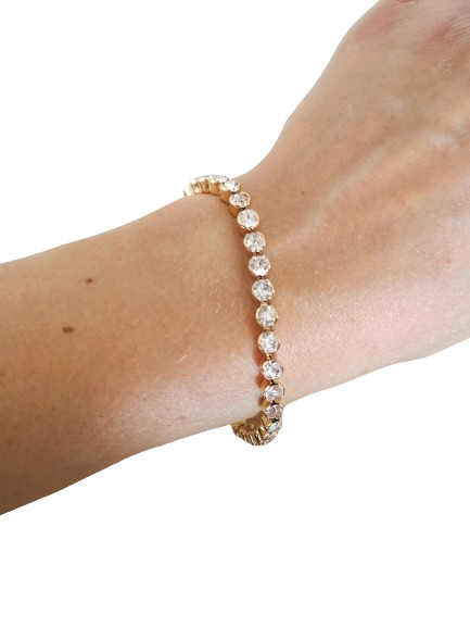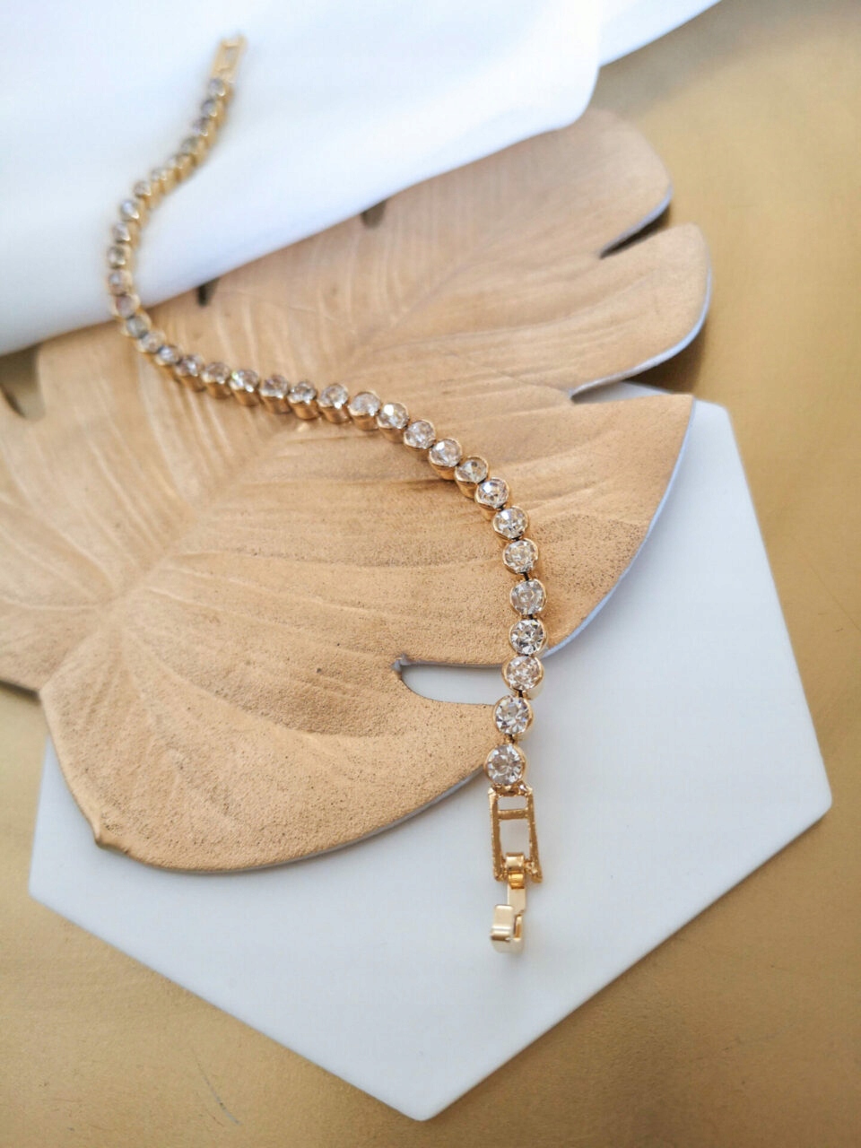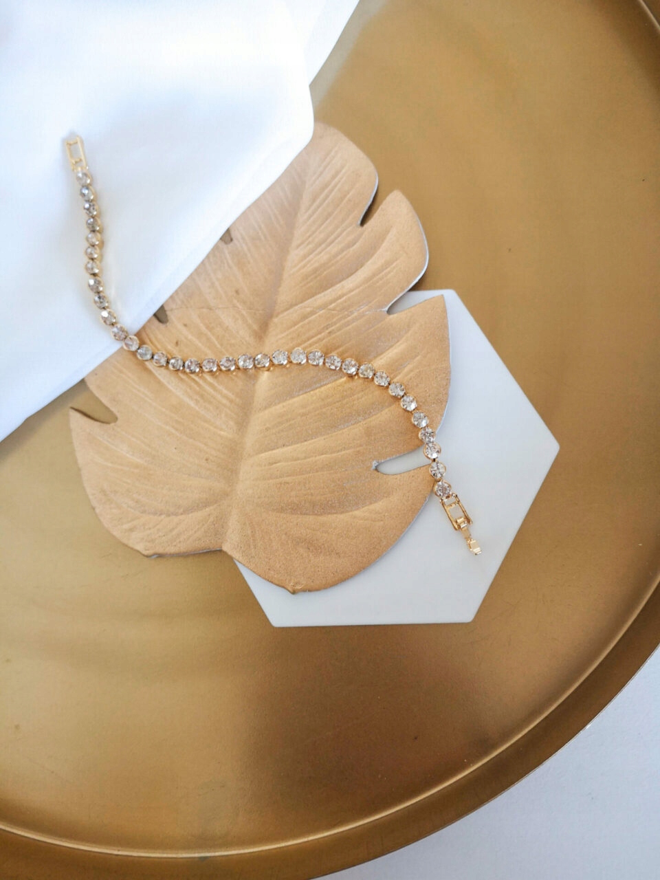 Простий золотий браслет - це простота, елегантність та спалах в одному. Прикраса, яка не нав'язує, а чудово прикрашає. Круглі стрази обрамлені золотими елементами. Браслет ідеально доповнить решту елементів весільних прикрас у тону золота.