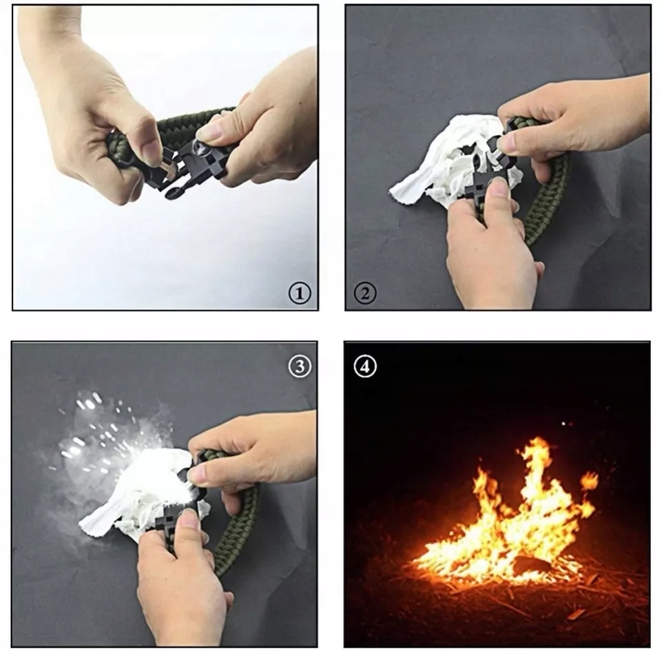 Пряжка містить ніж, розпалювач вогню з магнієм, він також має вбудований свисток, за допомогою якого ви можете легко видати високий попереджувальний звук. Застібка містить магнетієвий стрижень довжиною 1,7 см - при використанні ножа ви можете ефективно відбивати іскри, що дозволяє ефективно розпалити вогонь.