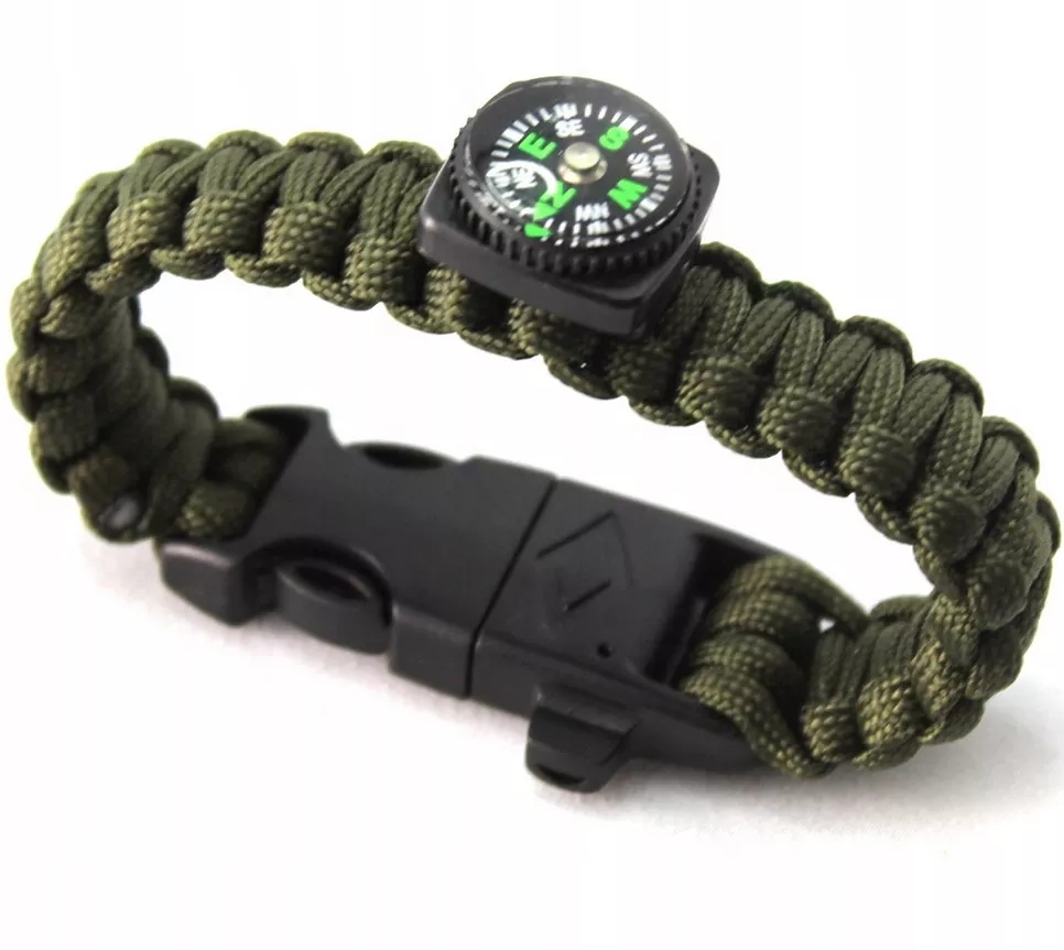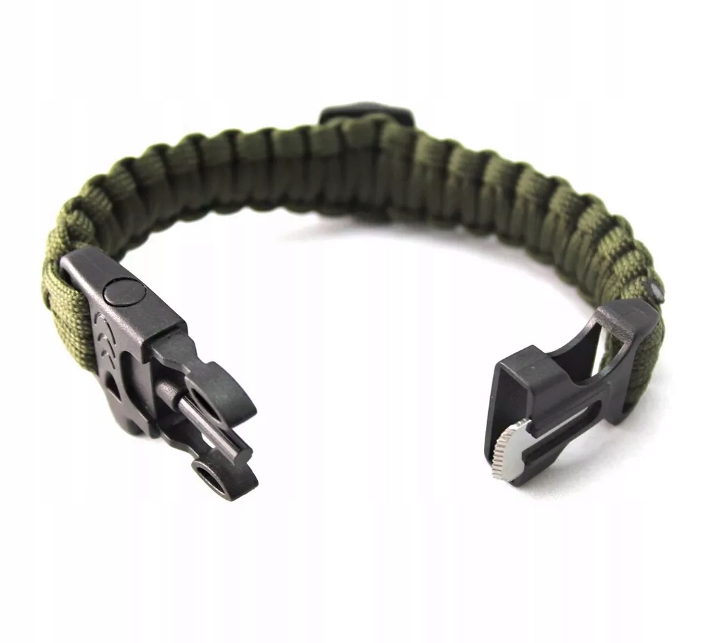 Браслет виготовлений із міцного матеріалу, дозволяє легко та швидко одягати та знімати весь гаджет та негайно використовувати індивідуальні розчини. Застібка кріпиться до паракордового шнура – легкого, міцного, використовується в парашутах, а тому широко використовується під час виживання.