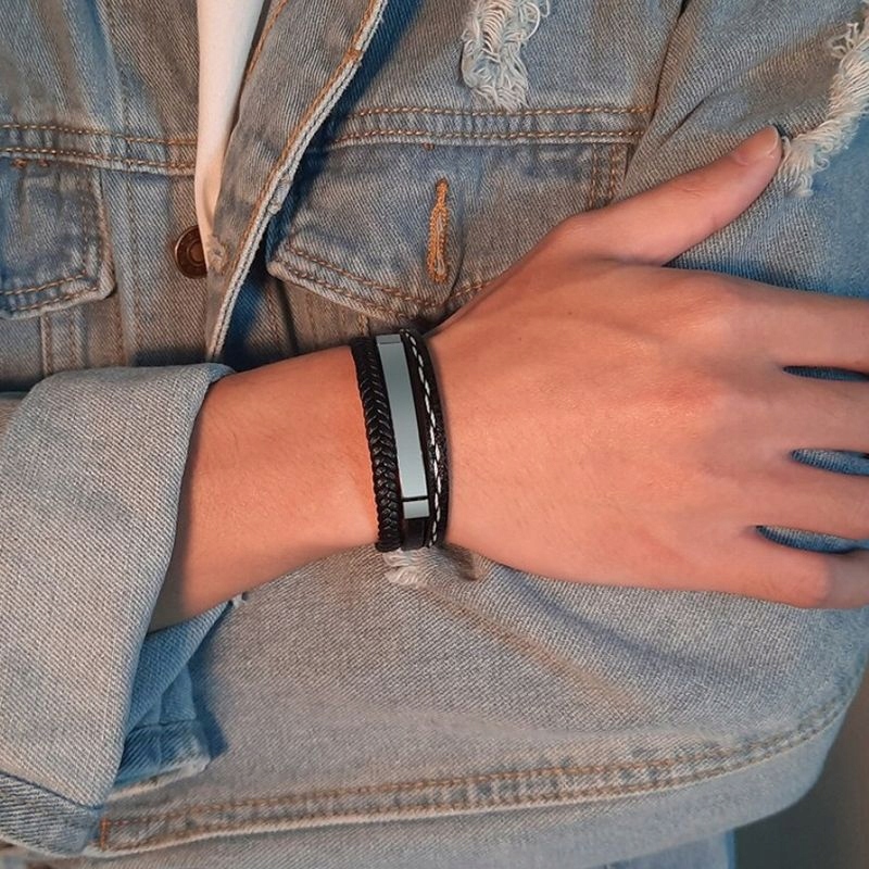 Стильний, елегантний браслет із високоякісної шкіри PU з мікрофіброю. Браслет складається зі з’єднаних між собою шкіряних ремінців чорного кольору. Середина , основний ремінець має поліровану пластину з хірургічної сталі 316L, також відомої як нержавіюча або ювелірна сталь. Крім того, цю поверхню можна використовувати для персоналізації шляхом індивідуального гравіювання, що зробить браслет ще більш унікальним. Чорні шкіряні ремінці зі сталевими деталями створюють оригінальне та елегантне доповнення до будь-якого типу творіння, навіть для вимогливих одержувачів. Один зі шкіряних елементів збагачений чорно-білою строчкою, а інший - плетінням тасьма, завдяки чому все виглядає нестандартно. Виріб також має зручну металевузастібкуз високим блиском і глянсовим покриттям. Шкіряні вставки профільовані відповідно до форми зап'ястя. М'якість і еластичність матеріалу робить його зручним у використанні. Дуже міцний продукт, виготовлений з особливою ретельністю та увагою до деталей з матеріалів найвищої якості. Його унікальний та винятковий дизайн також зробить його ідеальним у якостіподарунку.