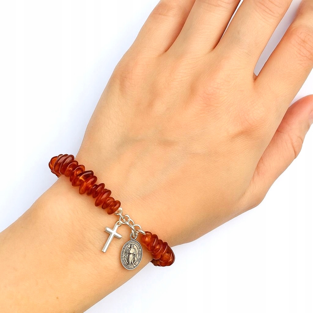 Завдяки поєднанню природного бурштину з тонкими, металевими символами віри, цей браслет поєднує елегантність та духовне значення.
