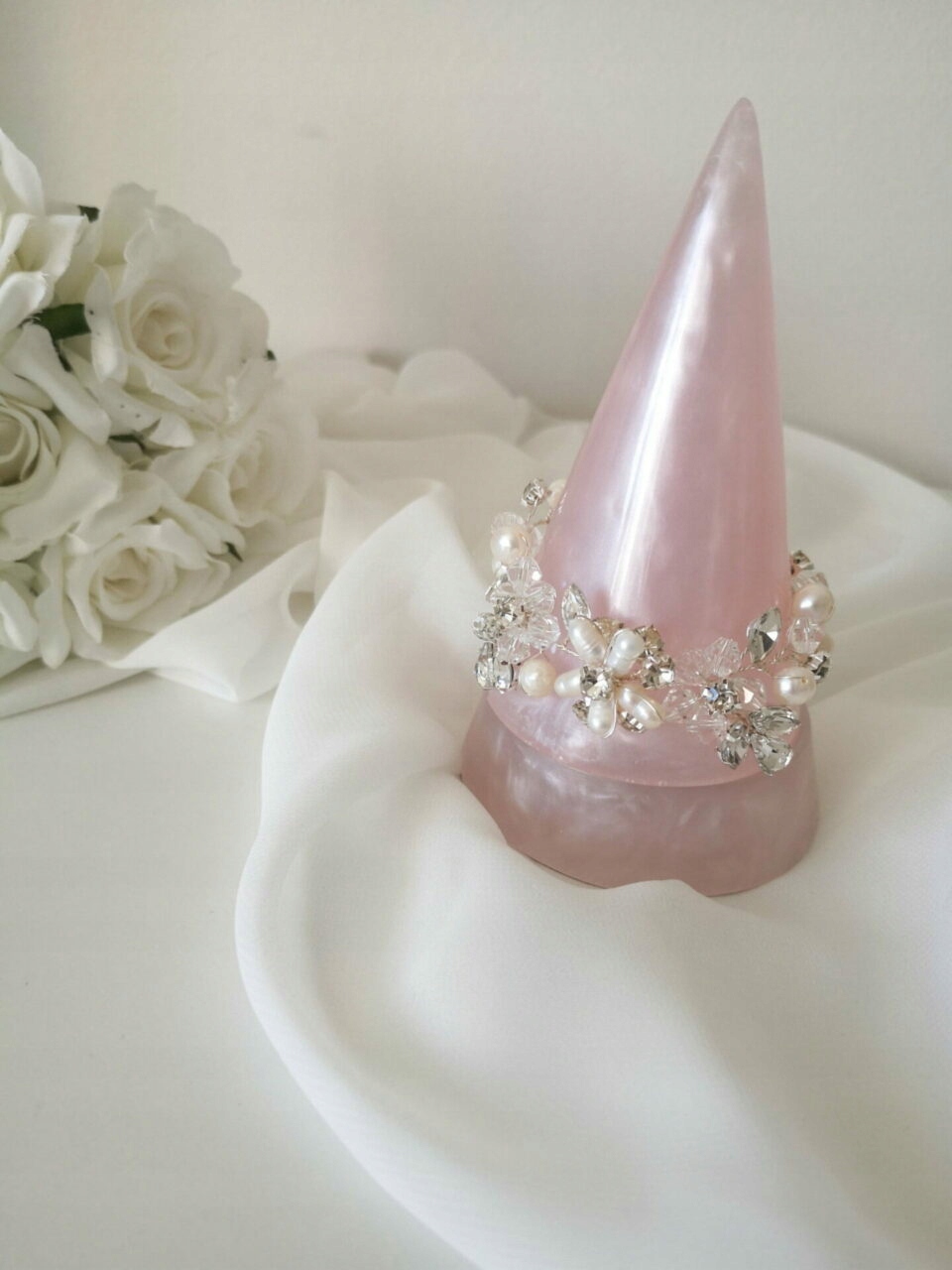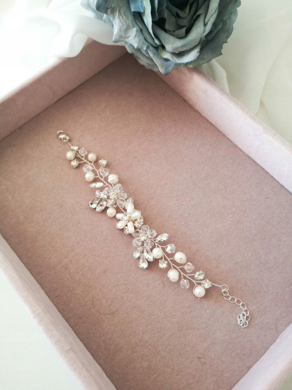 Гарний браслет із кристалами, цирконами та перлами. Прикраси кріпляться на ювелірний дріт, завдяки чому вони ідеально лягають в руку, при цьому легкі і не сковують рухів. Ідеальне доповнення до стилю весільної сукні білого або кольору екрю в класичному або гламурному стилі.