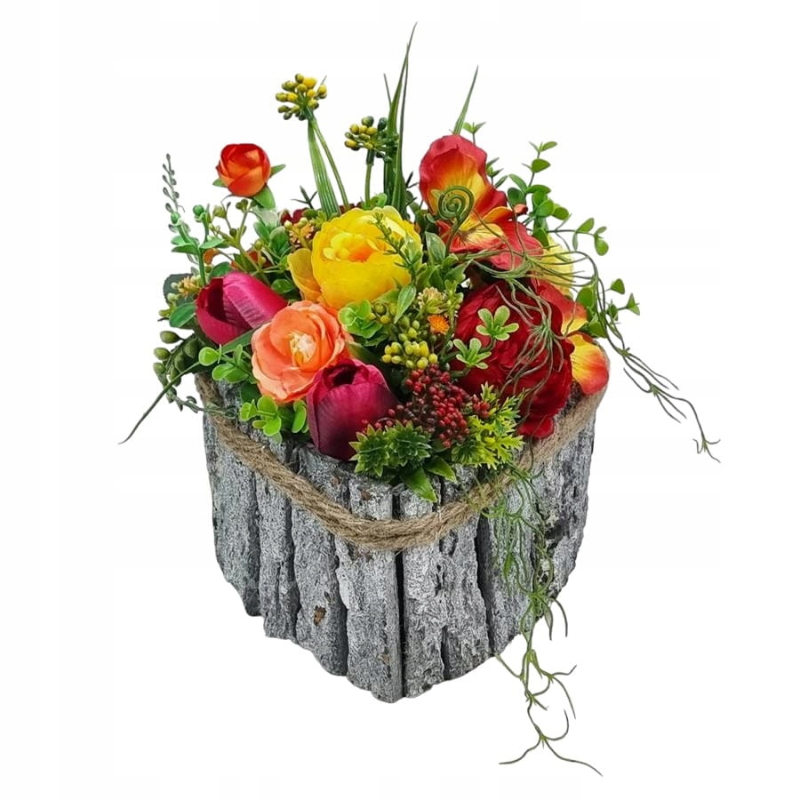 Прикраса з весняними квітами, розміщена в міцному дерев’яному горщику у формі серця. Квіти виглядають чудово, виглядають живими.