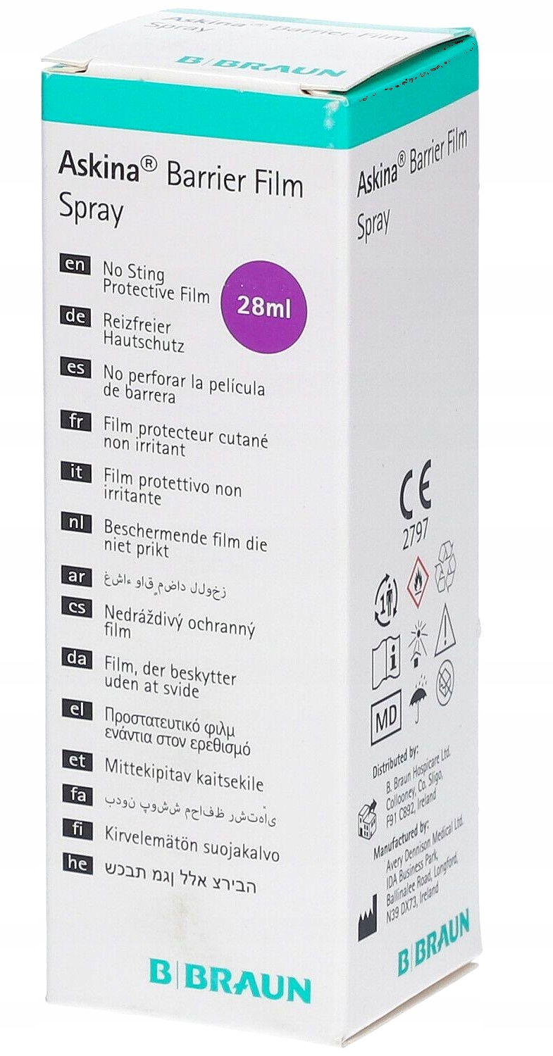 Бар'єрна плівка Askina - полімер, виховання та захисний шкірний бар'єр, який не викликає випічки. Швидко сушіння, повітряне прохідне. Розмороження);