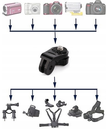 Адаптер дозволяє приєднати традиційну камеру або камеру, прикріплену до 1/4 '' на ручках, спеціально адаптованих до камер gopro !
