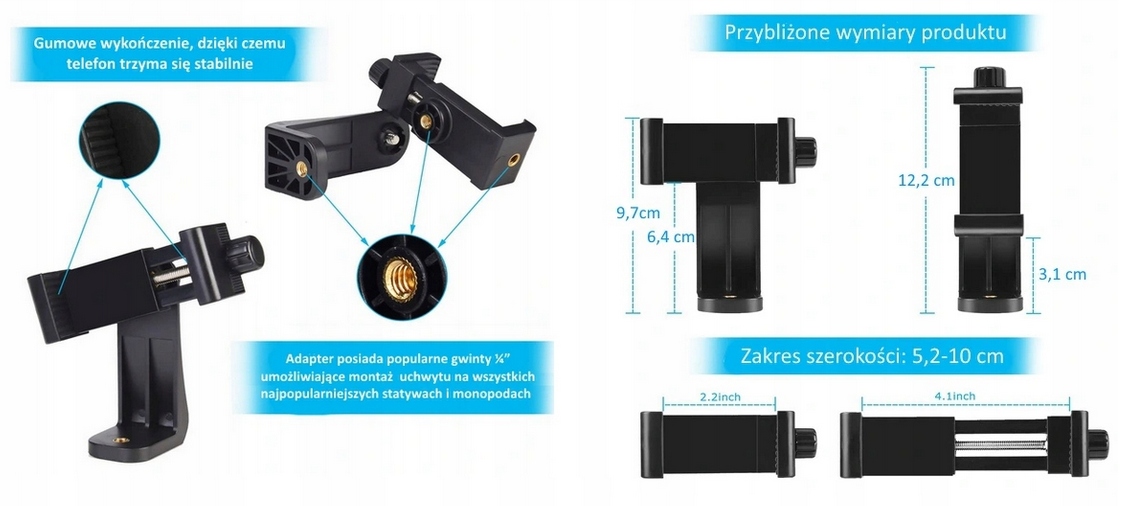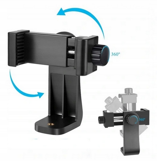 Універсальний адаптер дозволяє зручно та безпечно кріпити мобільний телефон майже до кожного штатива або селфі з стандартною кріпленням ¼ ". обертається на 360 градусах, щоб можна було встановити телефон як у горизонтальному положенні і вертикалі.