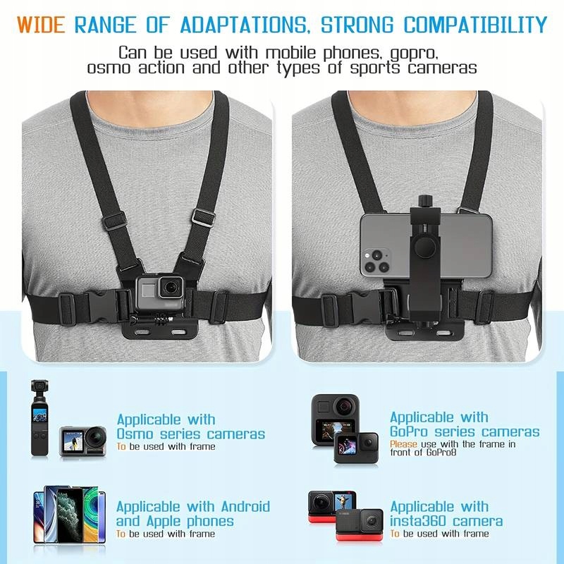 • Ремені для кріплення на грудях телефону для катання на лижах, риболовлі, велосипеда, мотоцикла, без рук для коментування відео. Ми не рекомендуємо вам використовувати його під час запису відео під час стрибків і бігу, коли ви ввімкнете функцію «анти-тремтіння» на своєму телефоні, ефект запису відео стане кращим.
