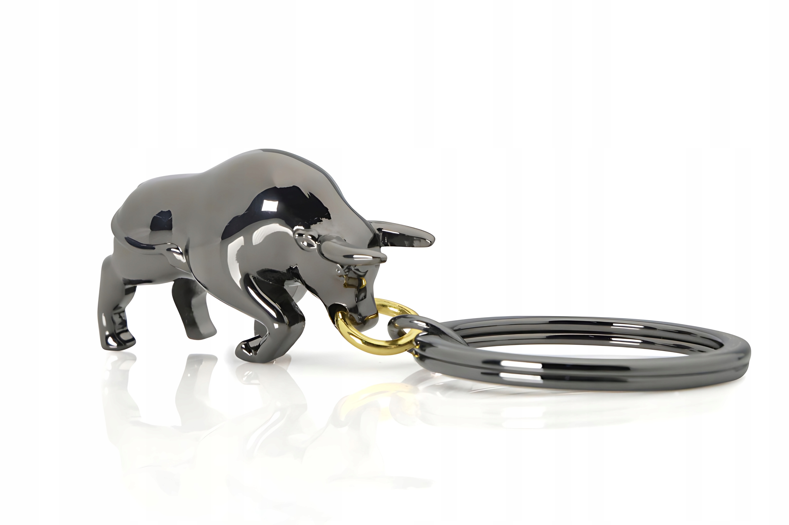 Чорний цинковий сплав, з якого виготовлено брелок із биком, доповнено золотою вставкою — сережкою, за якою впізнають цю тварину, особливо коли вона хвилюється на червоне тканина. Фігурка ідеально вписується в плоске кільце, яке можна використовувати для кріплення до будь-якого предмета або для розміщення на ньому ключів.