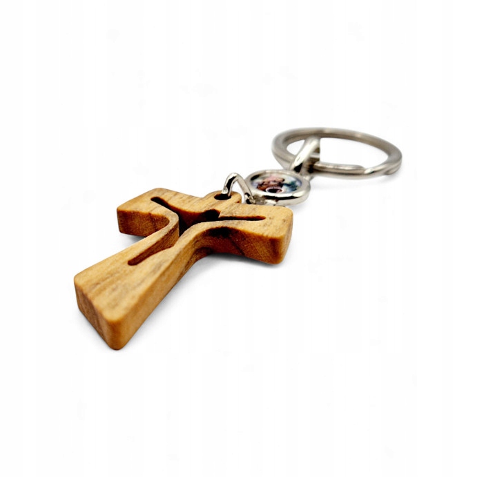 - Елегантний і практичний брелок із хрестом Святого Франциска (Тау), виготовлений із натурального дерева та металу