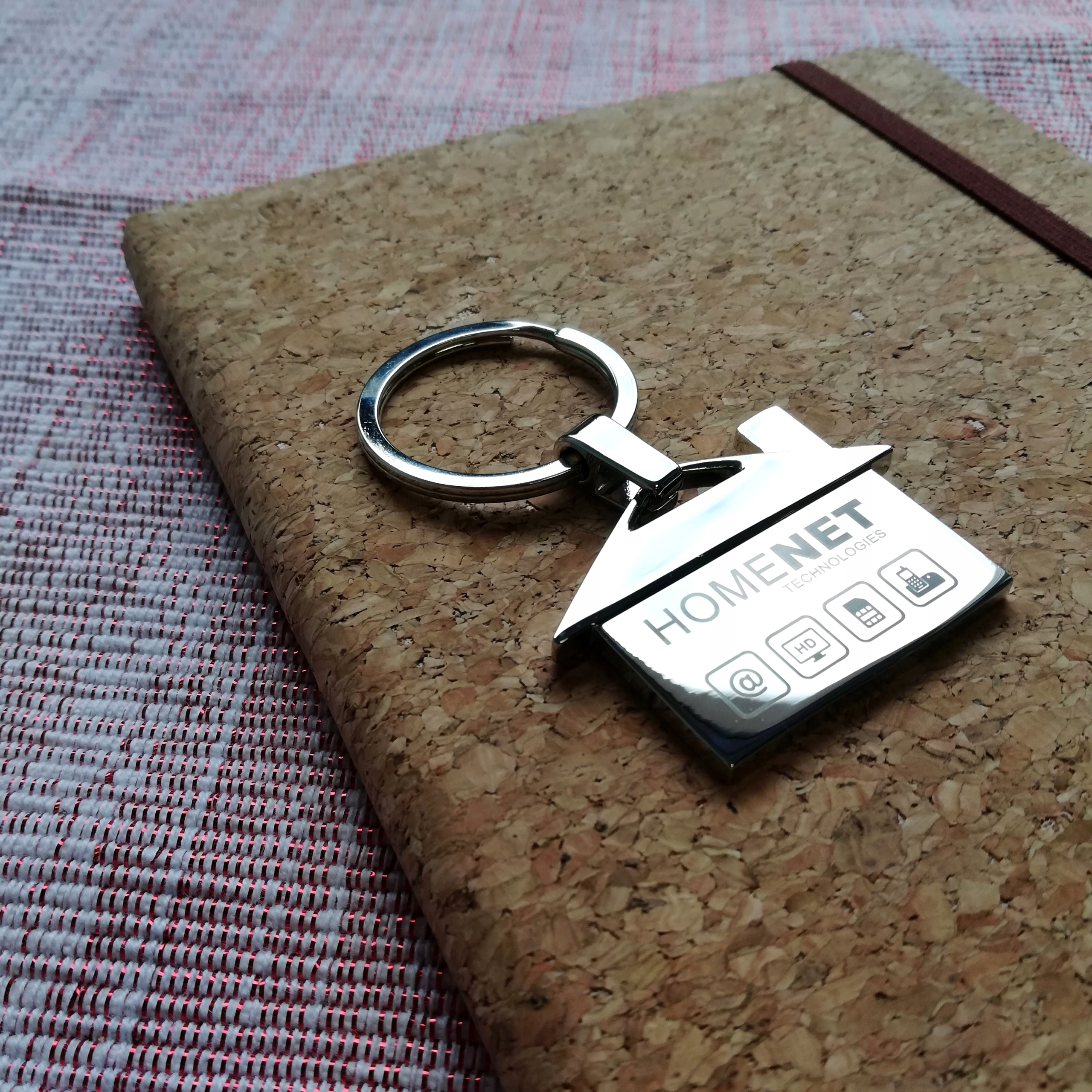 Брелок з підвіскою у формі будиночка, виготовлений з хромованого металу. Двосторонній брелок упакований в конверт.