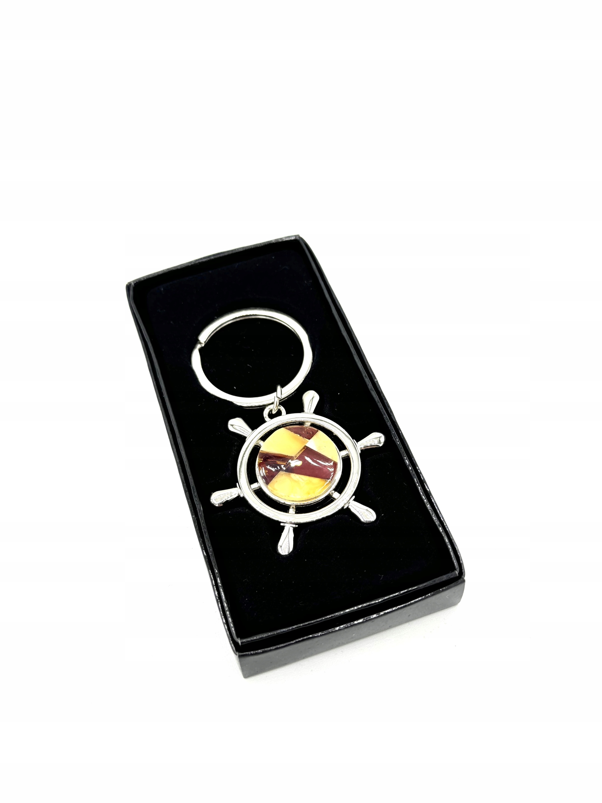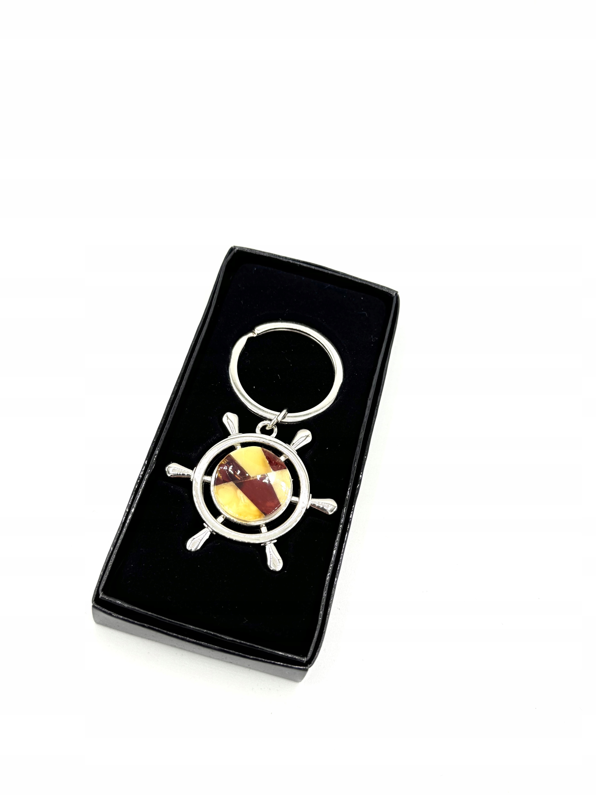 Brelok elegancki do kluczy z bursztynem, koło sterowe