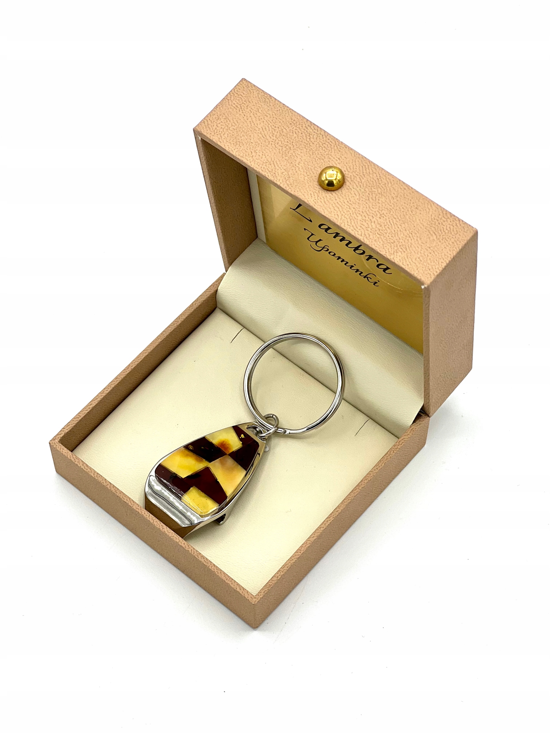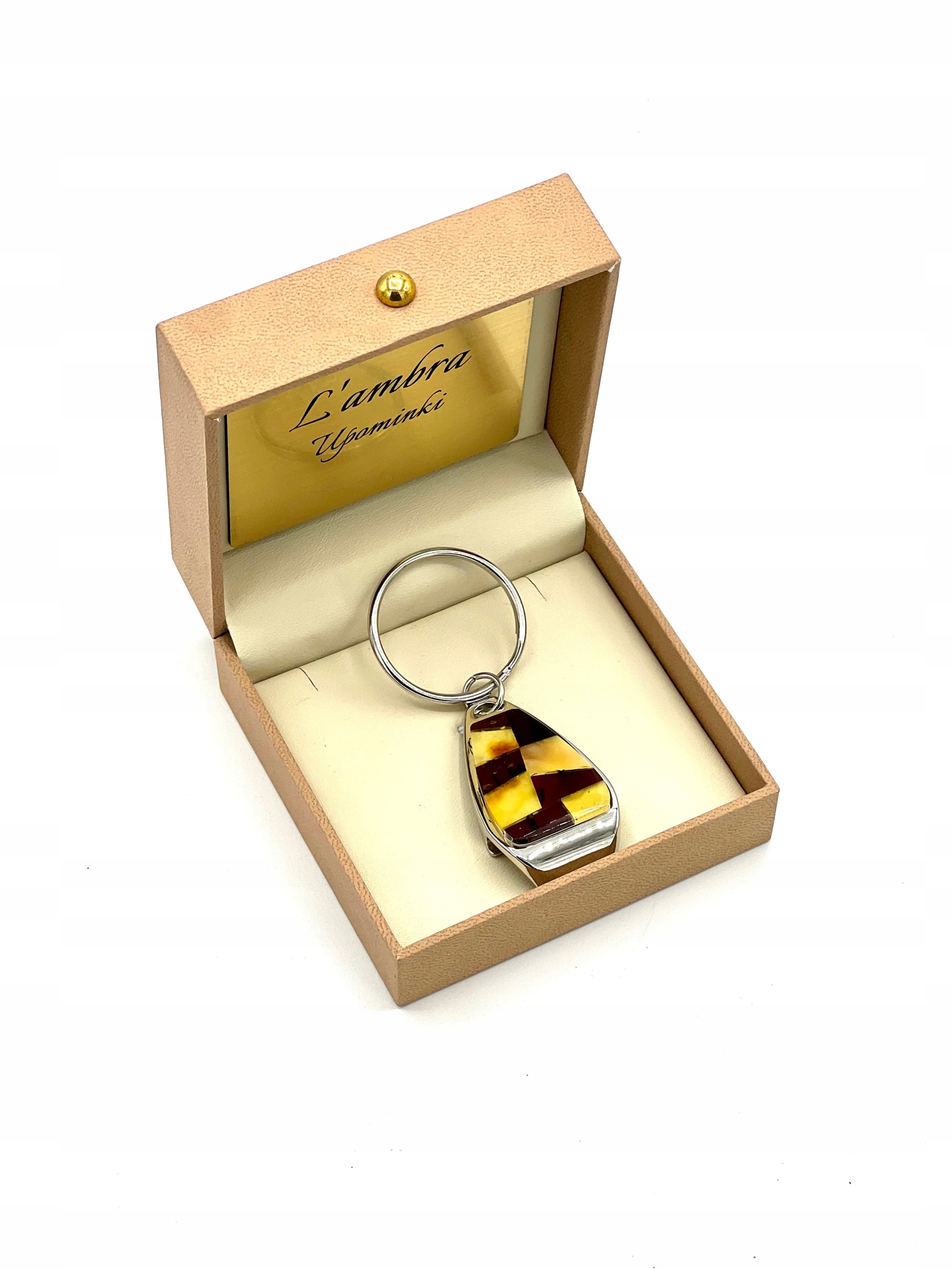 Brelok elegancki do kluczy z bursztynem, otwieracz do butelek