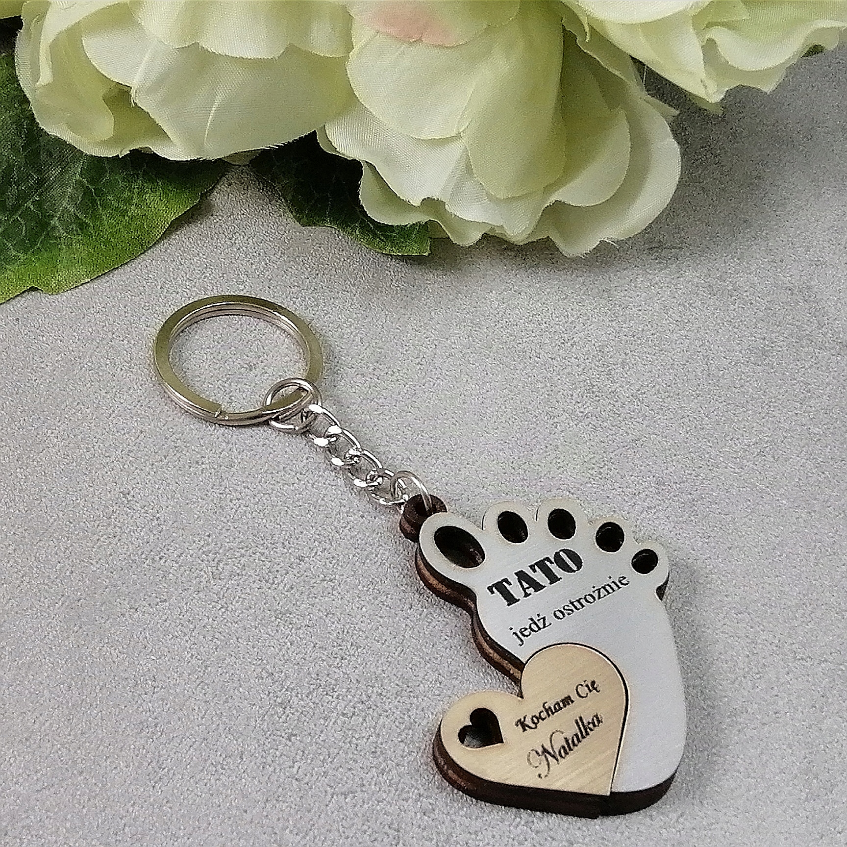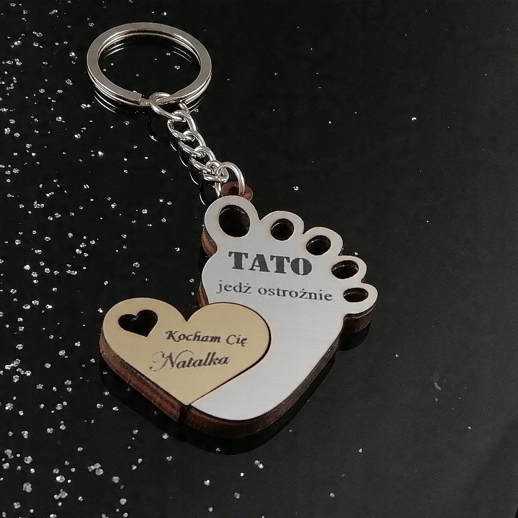 Чудовий персоналізований брелок, на якому можна написати свій текст або імена своїх близьких. Брелок виготовлений з березової фанери товщиною 4 мм (пофарбований і захищений акриловим лаком) і срібного і золотого ламінату з гравіруванням з одного боку. Гравірування є постійним методом і не буде стерто.