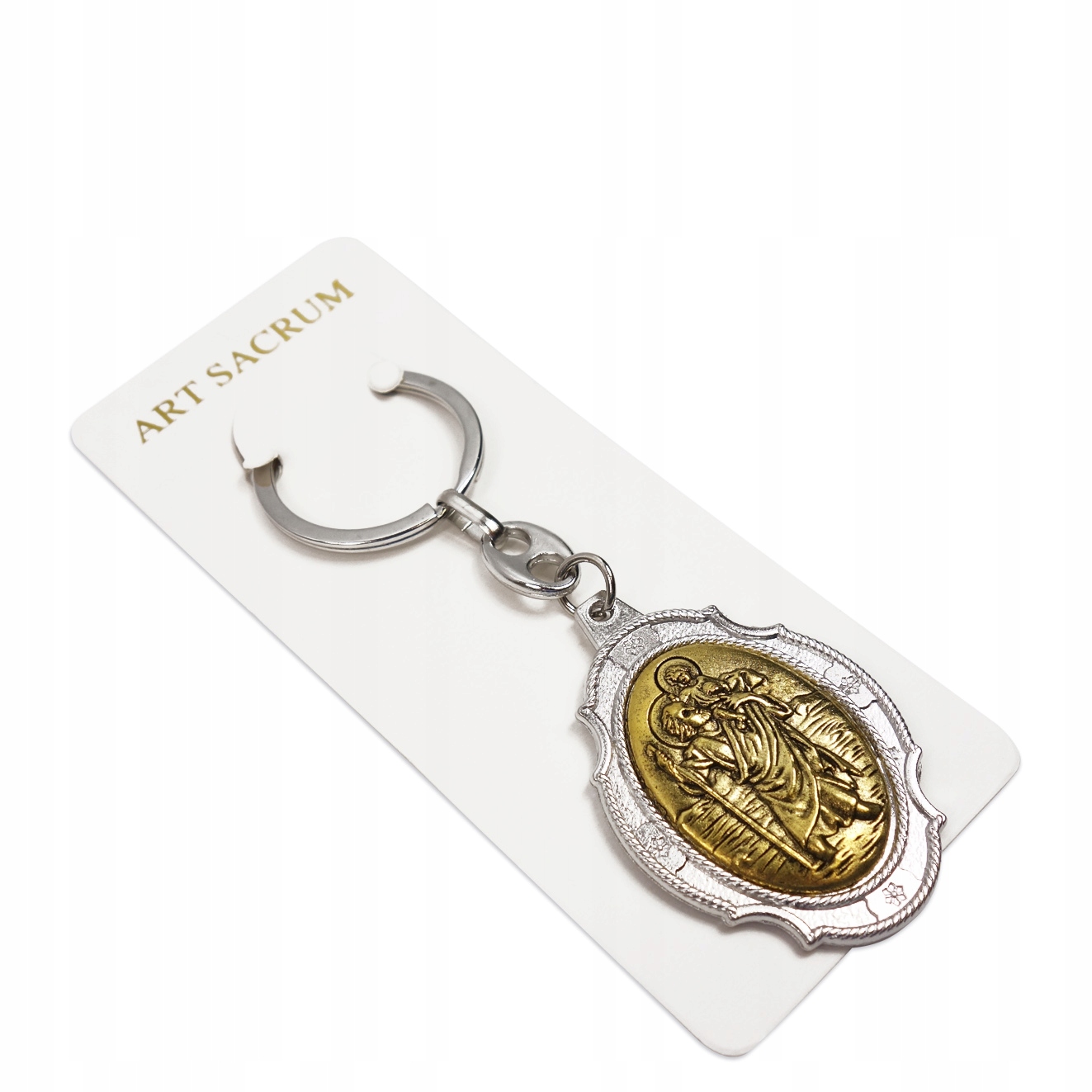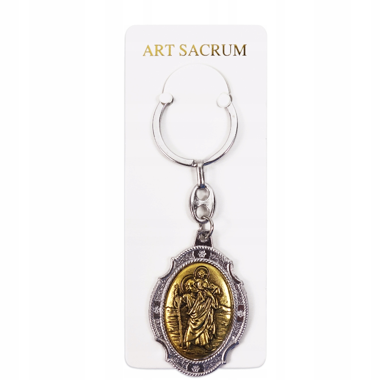 4 Він представляє святого Криштофа, що несе немовля Ісуса на плечах, що стосується відомої легенди і підкреслює захисний характер святого. Ключове кільце має овальну форму і підвішено на суцільну металеву ручку, завдяки якому воно ідеально підходить для клавіш, автомобіля або в подарунок для водія. Естетична ефективність та увага до деталей роблять це як практичним, так і духовним.
