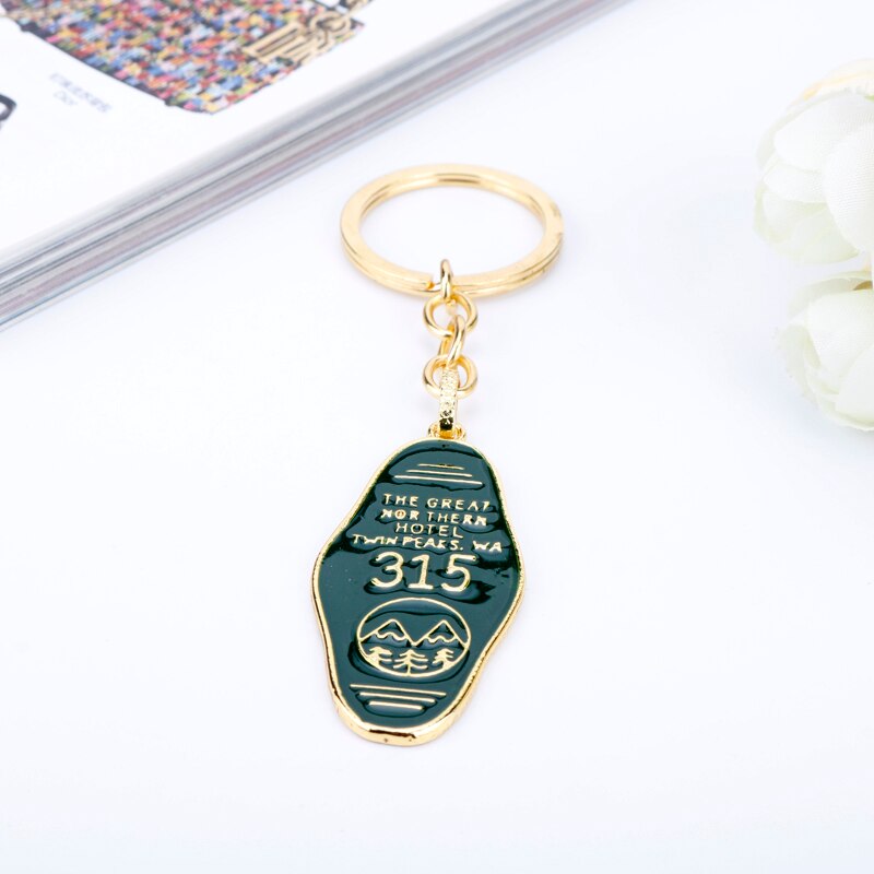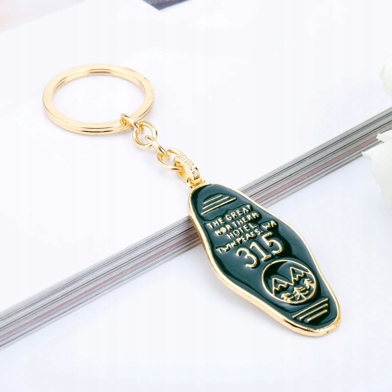 Ключ для ключів у стилі серії Twin Peaks, виготовлений із металу золотого кольору з зеленою емаллю, ширина кулона приблизно 2,5 см, висота приблизно 5 см.