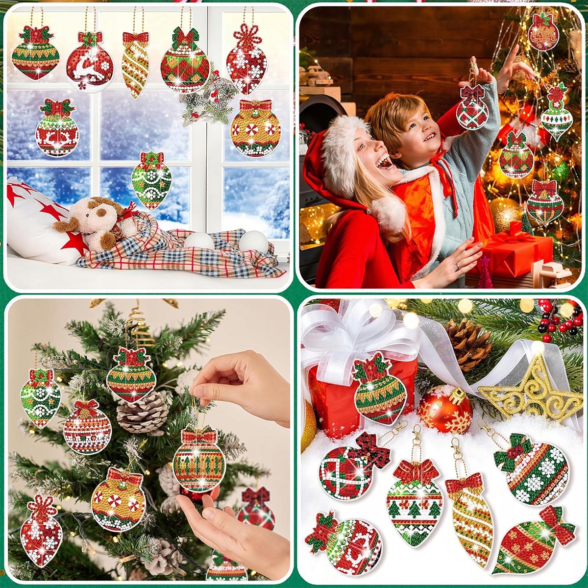 Ці набори для малювання діамантами для дітей можна використовувати не лише як бірки для подарунків, ярликів для вітальних листівок, брелоків тощо, а й як найкращі різдвяні та ялинкові прикраси, які широко використовуються для рюкзаків, садів, веранд, балконів, вікон і камінів. Цей різдвяний набір алмазного живопису – найкращий різдвяний подарунок для вашої родини, друзів і дітей!