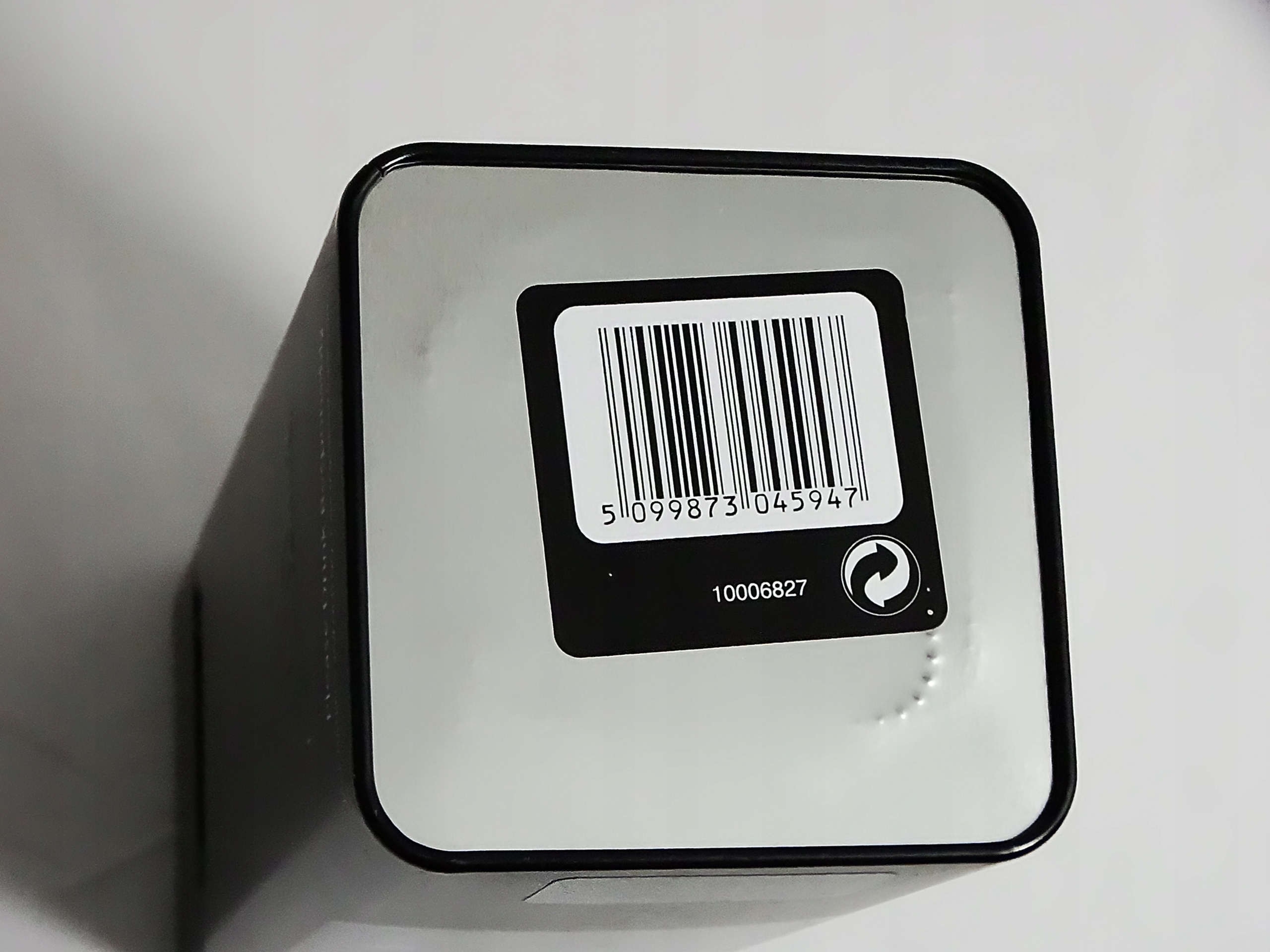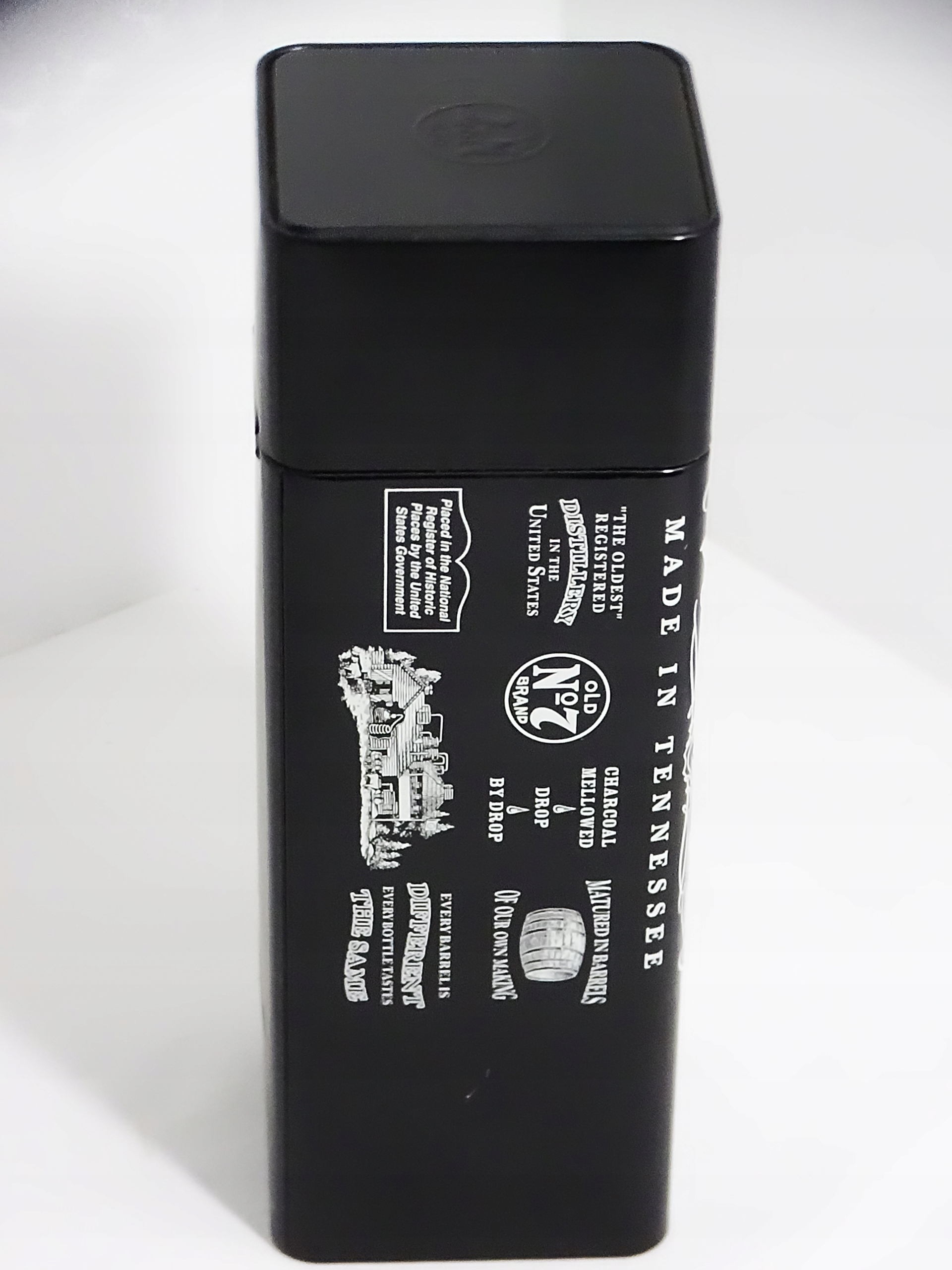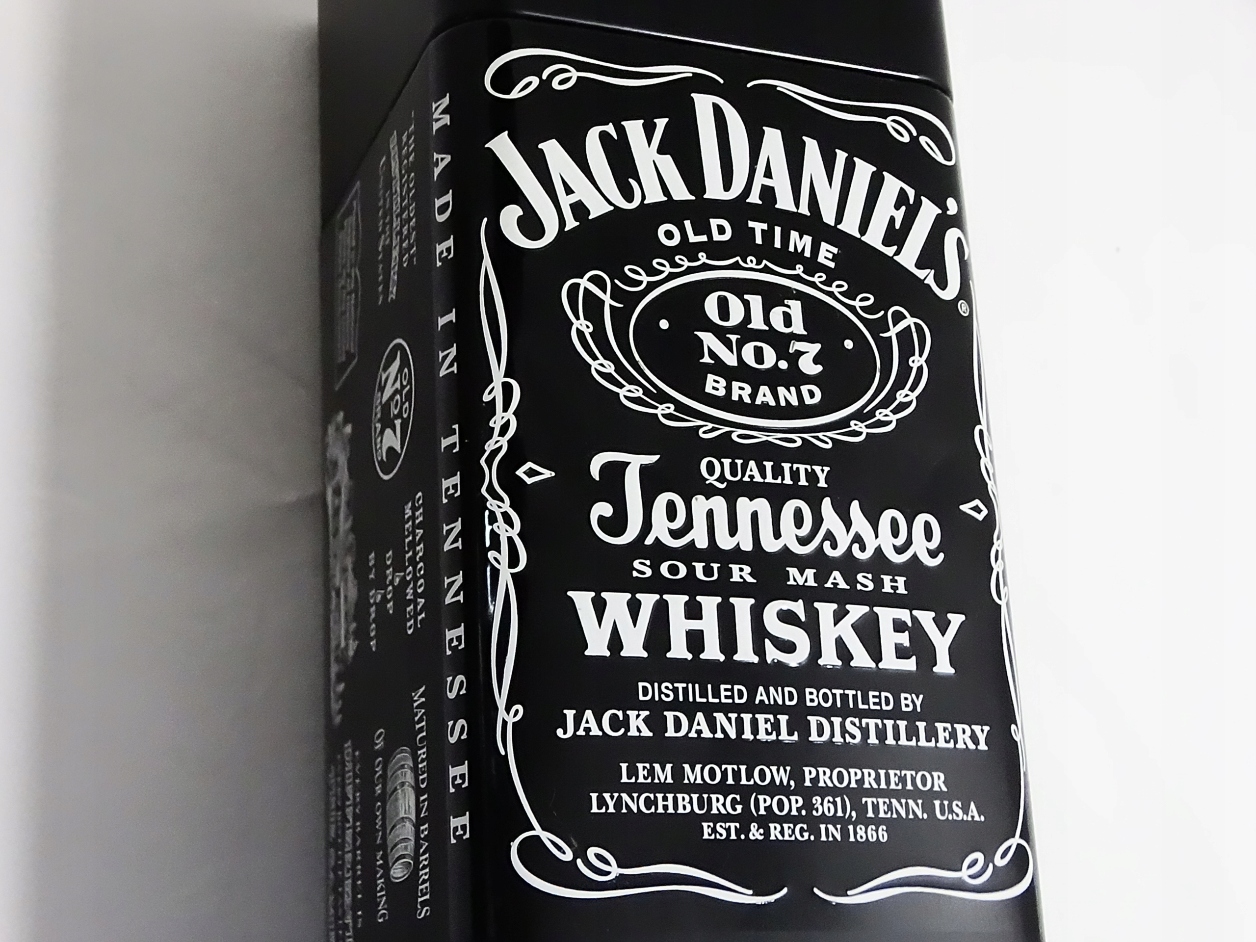 На фотографії, яку ви надіслали, я бачу чорну металеву банку з білими написами та декоративними елементами, зображуючи класичний логотип віскі Теннесса Джека Даніеля. Він показує написи "Бренд №2 старого часу", "Зроблено в Теннесі", та інформацію про спиртзавод у Лінчбурзі, штат Теннессі, США. Це, мабуть, обмежене видання або упаковка колекціонера віскі Джека Даніеля.