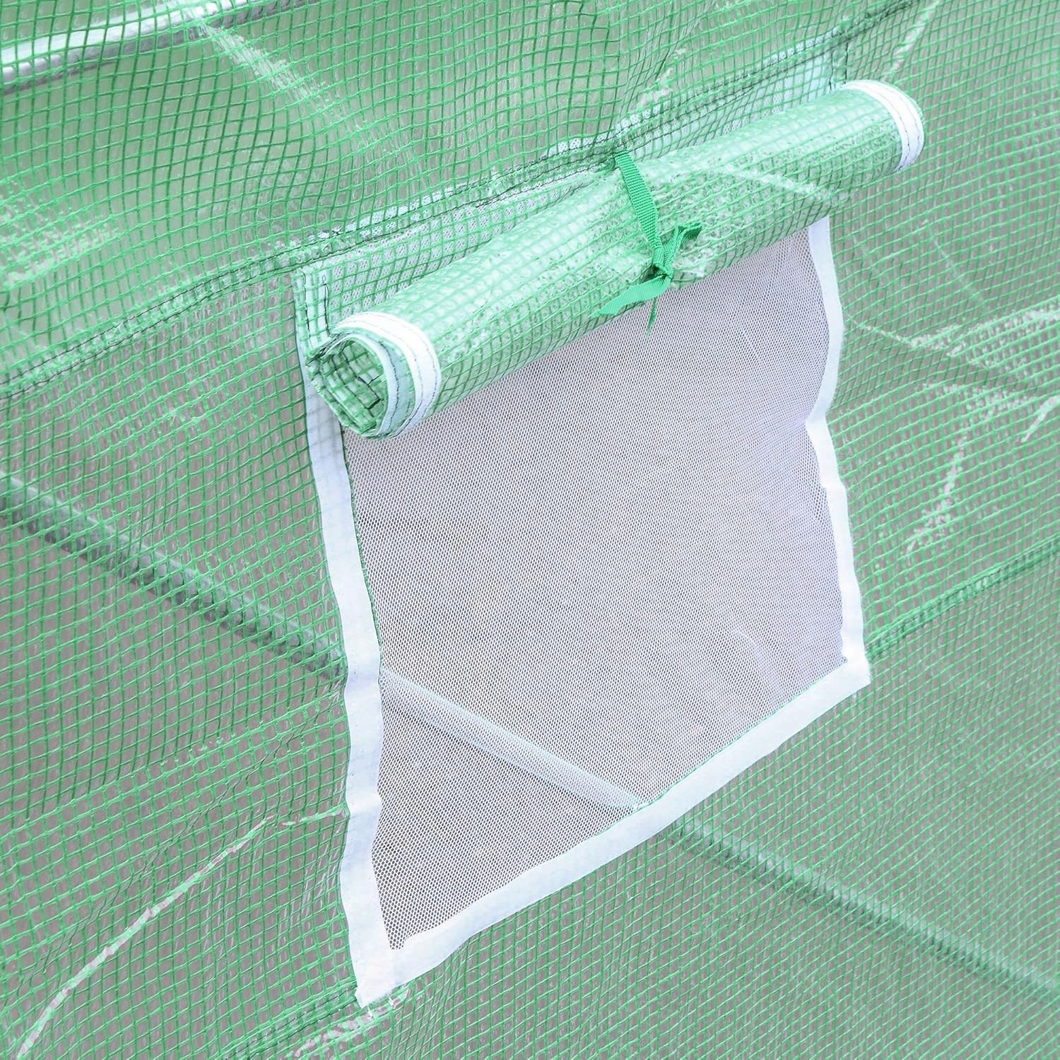 4Відмінна вентиляція: Запасна парникова кришка з 8 згорнутими бічними вікнами з сітками комарів (струна для зв'язування кожної) + згорнуті двері до повзунка, щоб ідеально адаптуватися до погодних умов (потреба в вентиляції та закритті).