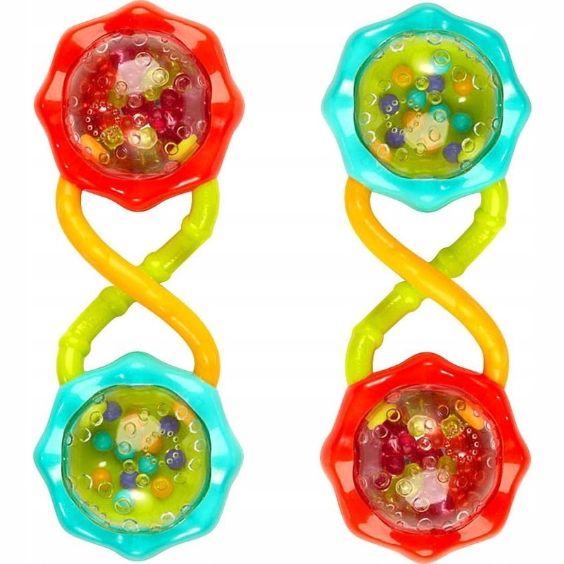 Прозоре брязкальце з різнокольоровими намистинами, яке легко взяти та тримати маленькими ручками. Крім того, ручка-брязкальце має опуклий візерунок, що є додатковим пізнавальним атракціоном для дитини та запобігає вислизанню іграшки з рук. Дзеркало та намистини всередині відбивають світло, створюючи цікаві візуальні ефекти для дитини.