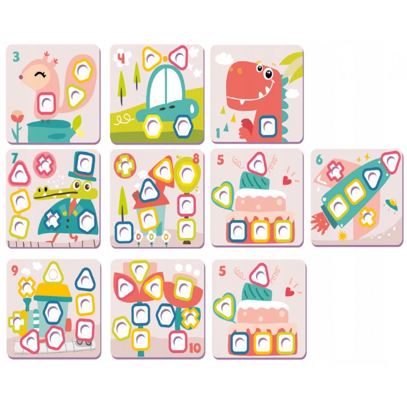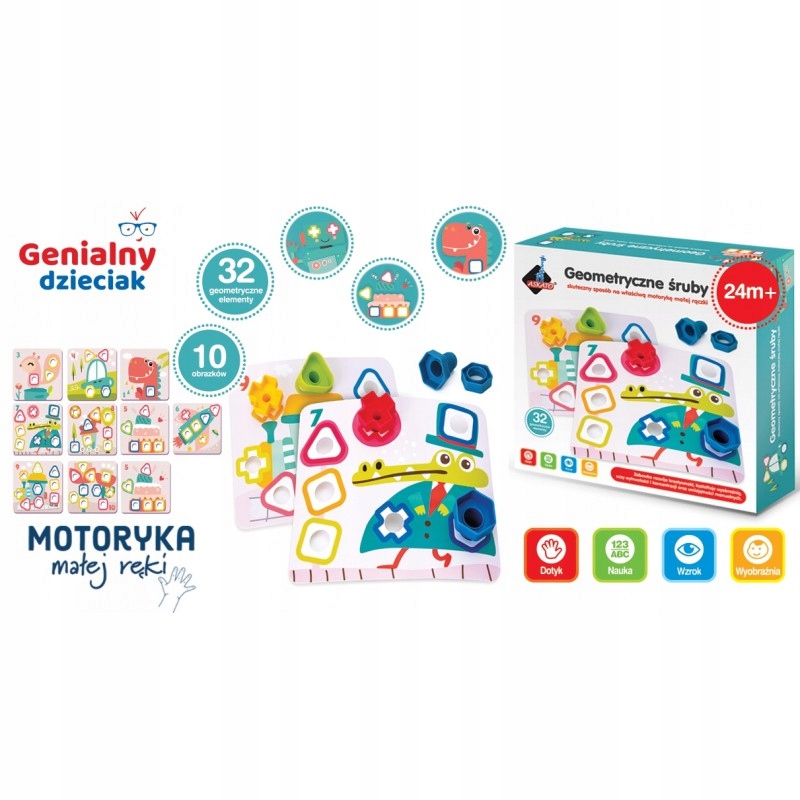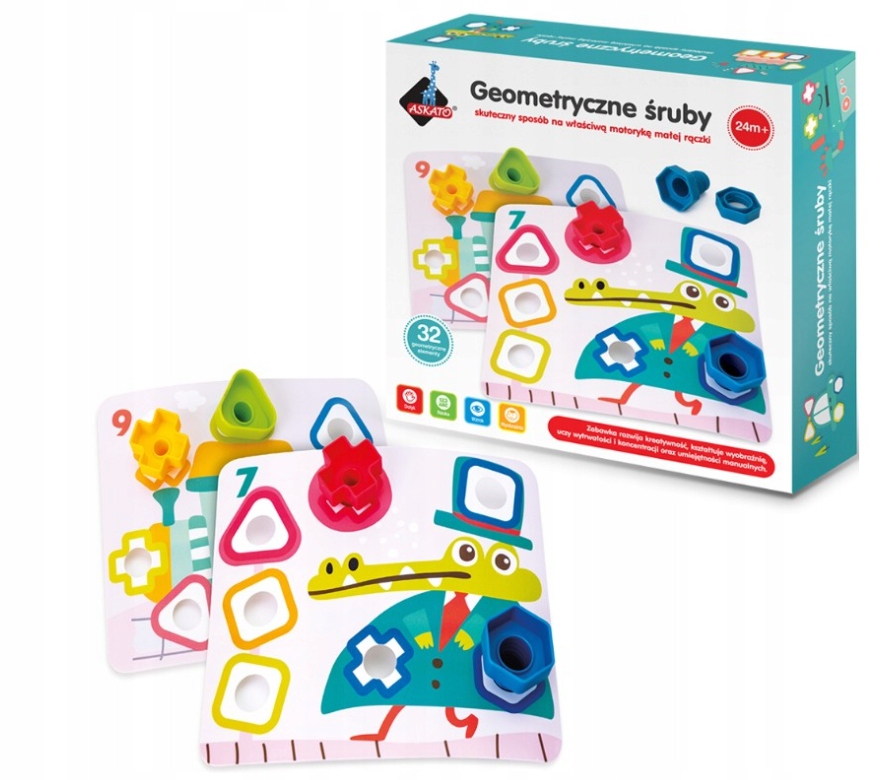Geometric Bolts це чудова креативна іграшка з великими різнокольоровими гвинтами та гайками за кольоровими шаблонами. Загвинчування та викручування гвинтів покращує спритність рук, координацію очей і рук і стимулює розвиток маленької дитини в багатьох сферах. Він стимулює почуття, пробуджує уяву та креативність і важливий для тренування дрібної моторики. Ви можете сортувати елементи за кольором або формою, або підібрати відповідну гайку до болта за кольором і формою. Ця діяльність розвиває моторику. Гвинти та гайки мають закруглені краї та були спеціально розроблені відповідно до індивідуальних потреб дитини, щоб забезпечити різноманітність тактильних відчуттів.