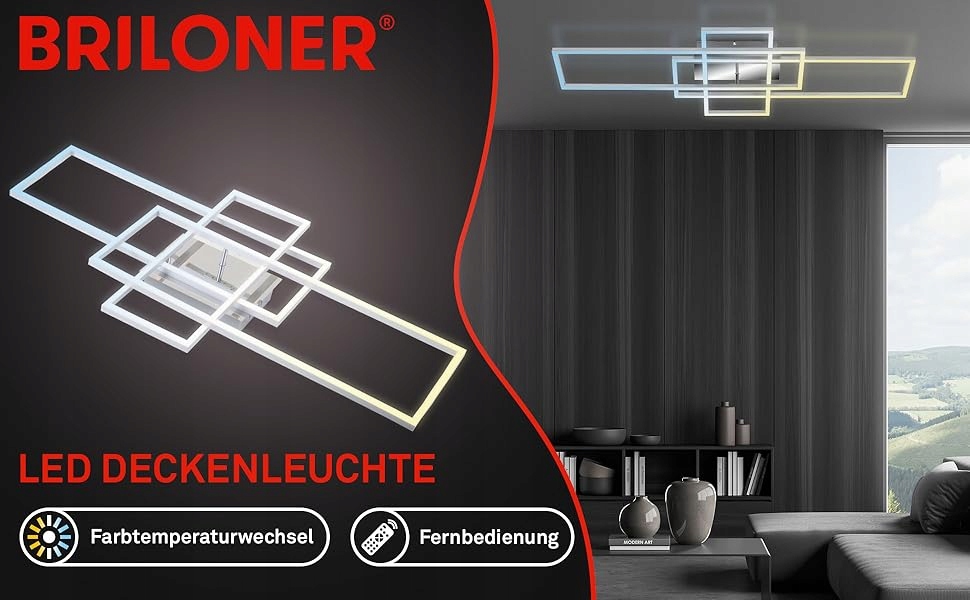 - Завдяки функції затемнення та зміні світлого кольору (від 2700 кевіна до 5000 кевіна; від теплого білого до нейтрального білого) ви можете адаптувати умови освітлення до своїх потреб та контролювати світло окремо. Крім того, лампа має функцію ліжка та таймера (стельова лампа автоматично вимикається приблизно через 1 хвилину) - всі функції можна легко керувати з дивана за допомогою кріпленого пульта дистанційного керування. До енергетичної потужності 55 Вт, загальна потужність світла 5500 люмен (2 х 2200 люмен і 1 х 1100 люмен) та кольорова температура 3000 кевінів (теплий, білий світлий колір) сучасна лампа забезпечує приємну, сприятливу атмосферу - Середнє життя становить близько 25 000 годин.