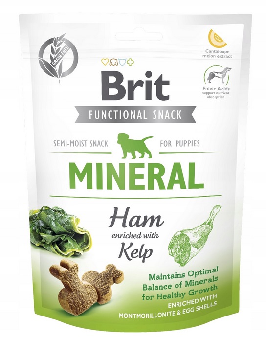 Functional Snack Mineral Ham Brit Care Puppy 150 г збагачений колагеном, який благотворно впливає на опорно-руховий апарат, фульвокислотами, які покращують засвоєння поживні речовини та молочнокислі бактерії, які допомагають підтримувати здорову мікрофлору кишечника